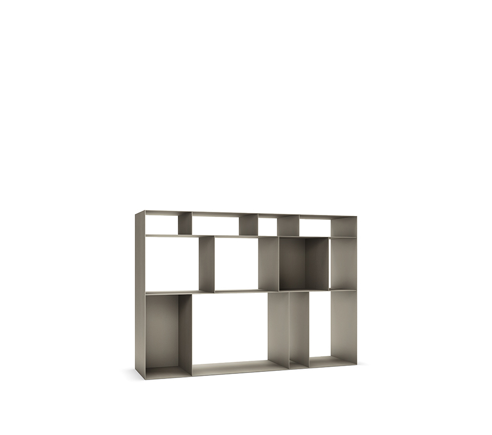 Una sola estantería, múltiples posibilidades. La estantería de metal modular Latitude está formada por un único módulo que puede repetirse, formando composiciones diferentes, para aprovechar al máximo el espacio y destacar las dimensiones de la habitación. Latitude es capaz de destacar la altura de una columna, con una composición vertical. Mientras que con la configuración rectangular, puede convertirse en una estantería divisoria que permite la vista a través de la misma. O bien, con la configuración horizontal puede funcionar como mueble de servicio apoyado a una pared o a la parte trasera de un sillón o de una cama, ubicados en el centro de la habitación El acabado metalizado brinda luminosidad y distinción a esta estantería contemporánea modular, capaz de adaptarse a cualquier necesidad de styling.