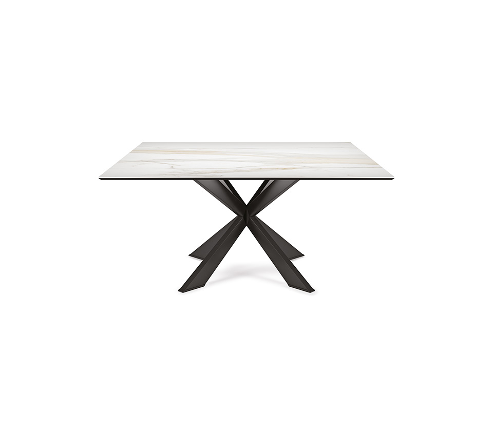 El modelo Spyder, una mesa de diseño realizada con grande atención al detalle y materiales de excelencia, permite de amueblar el salón con verdadero estilo. La sencilla base de acero en forma de X, con acabados brillantes que reflejan la luz, acentúa el material preciado del sobre.