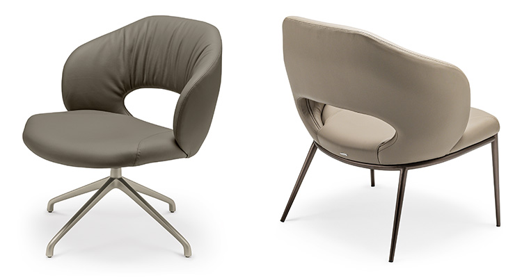 Esta silla con orificio en el respaldo luce, además, gracias a los suaves pliegues, como olas en la orilla, que acentúan la sensación de confort. La porción del asiento presenta una evidente y acogedora curvatura, que se destaca aún más por las costuras en relieve combinadas con la piel o el tejido: un toque de elegancia que destaca la maestría artesanal con la que se realiza.