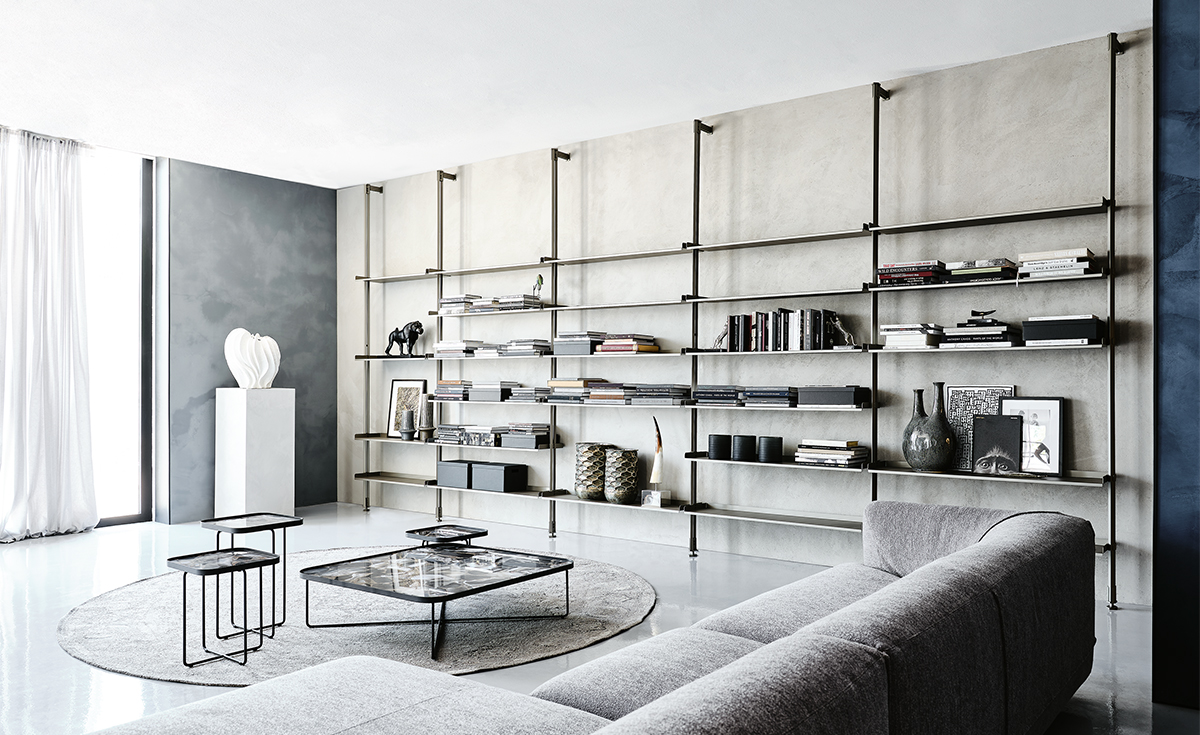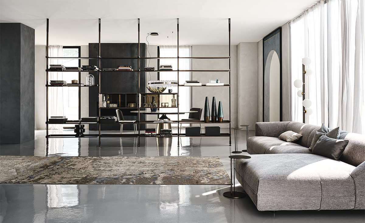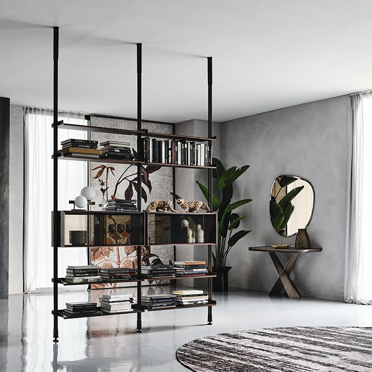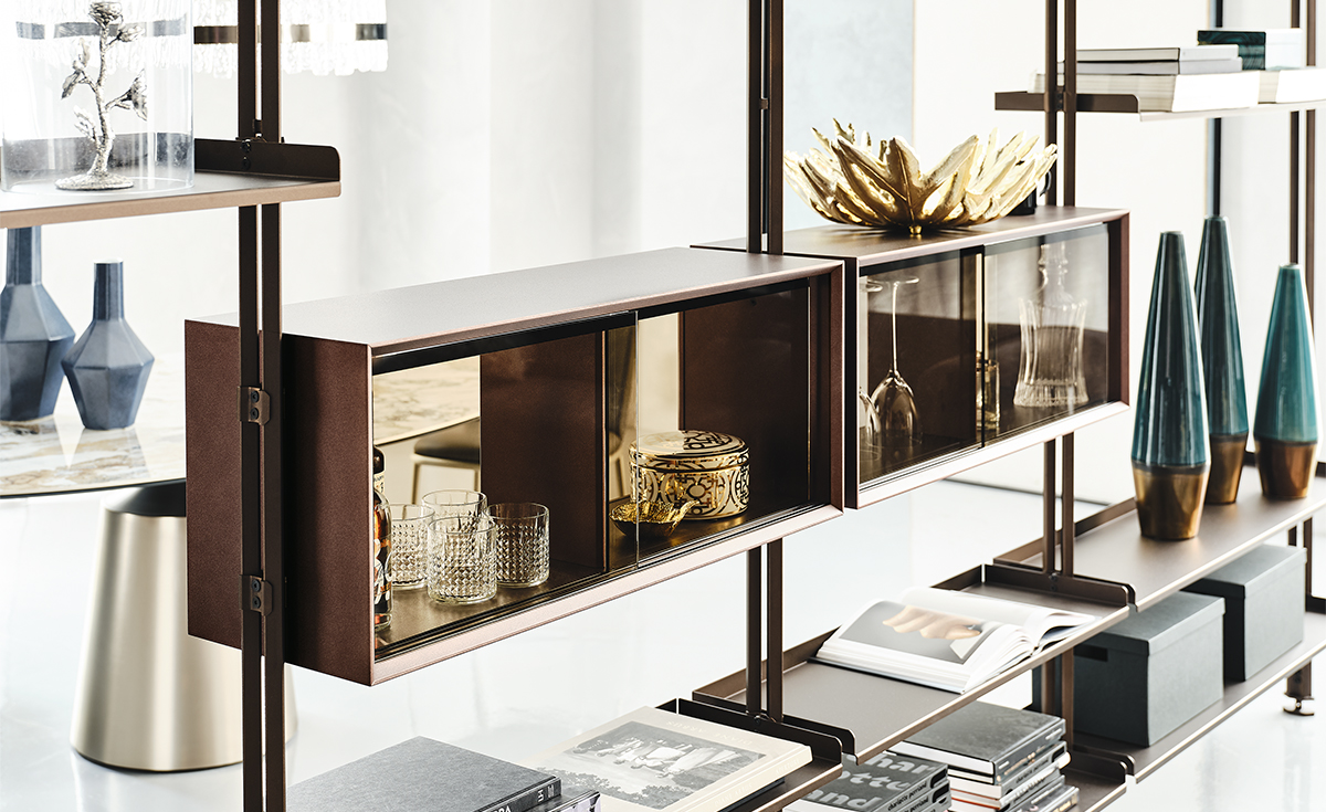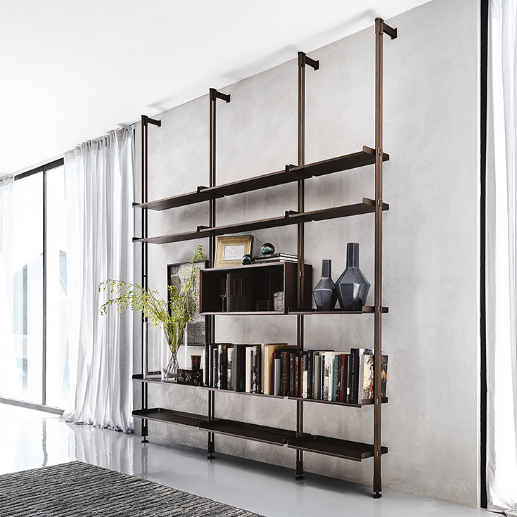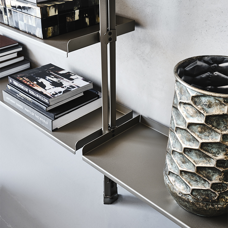Estantería componible con montaje a pared o a techo. Montantes, soportes y estantes en acero barnizado gofrado titanio (GFM11) o bronce (GFM18). Contenedores en madera gofrado titanio (GF11) o bronce (GF18) y cristal bronce.