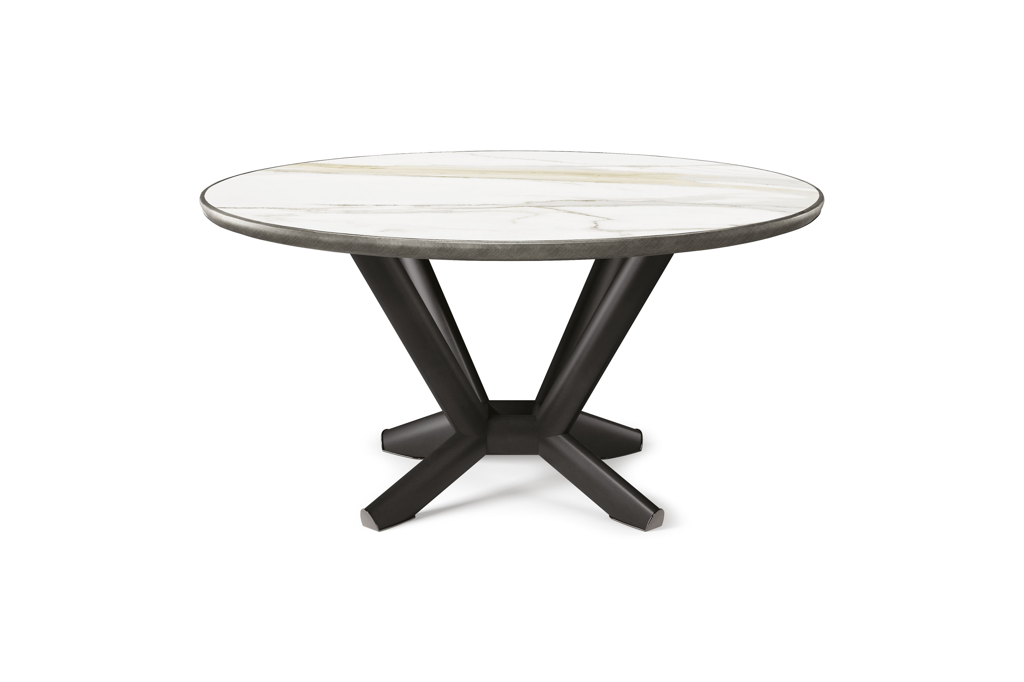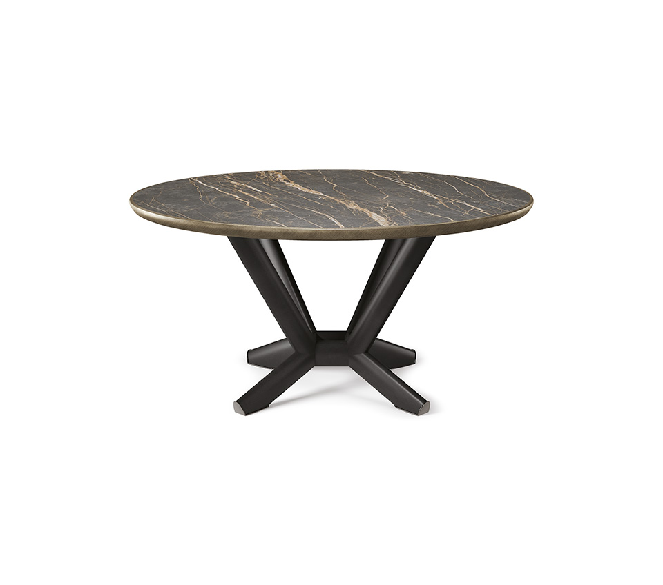 Mesa con base en acero barnizado gofrado titanio (GFM11), bronce (GFM18), graphite (GFM69) o negro (GFM73), Brushed Bronze o Grushed Grey. Sobre en cerámica Marmi colores Alabastro (KM02), Golden Calacatta mate (KM05), Golden Calacatta brillo (KM06), Portoro mate (KM07), Portoro brillo (KM08), Sahara Noir brillo (KM09), Makalu (KM11), Breccia (KM12), Borghini Calacatta opaco (KM18), Borghini Calacatta lucido (KM19), Colosseo (KM21), Andromeda (KM22), Invisible mate (KM24) o Luxor (KS23) y perfil inferior redondeado barnizado Brushed Bronze o Brushed Grey. Variaciones cromáticas y de cepillado del acabado Brushed son características de la producción artesanal y no deben considerarse como defectos.