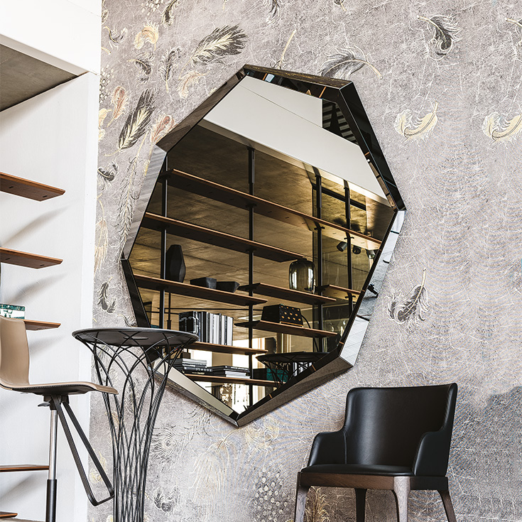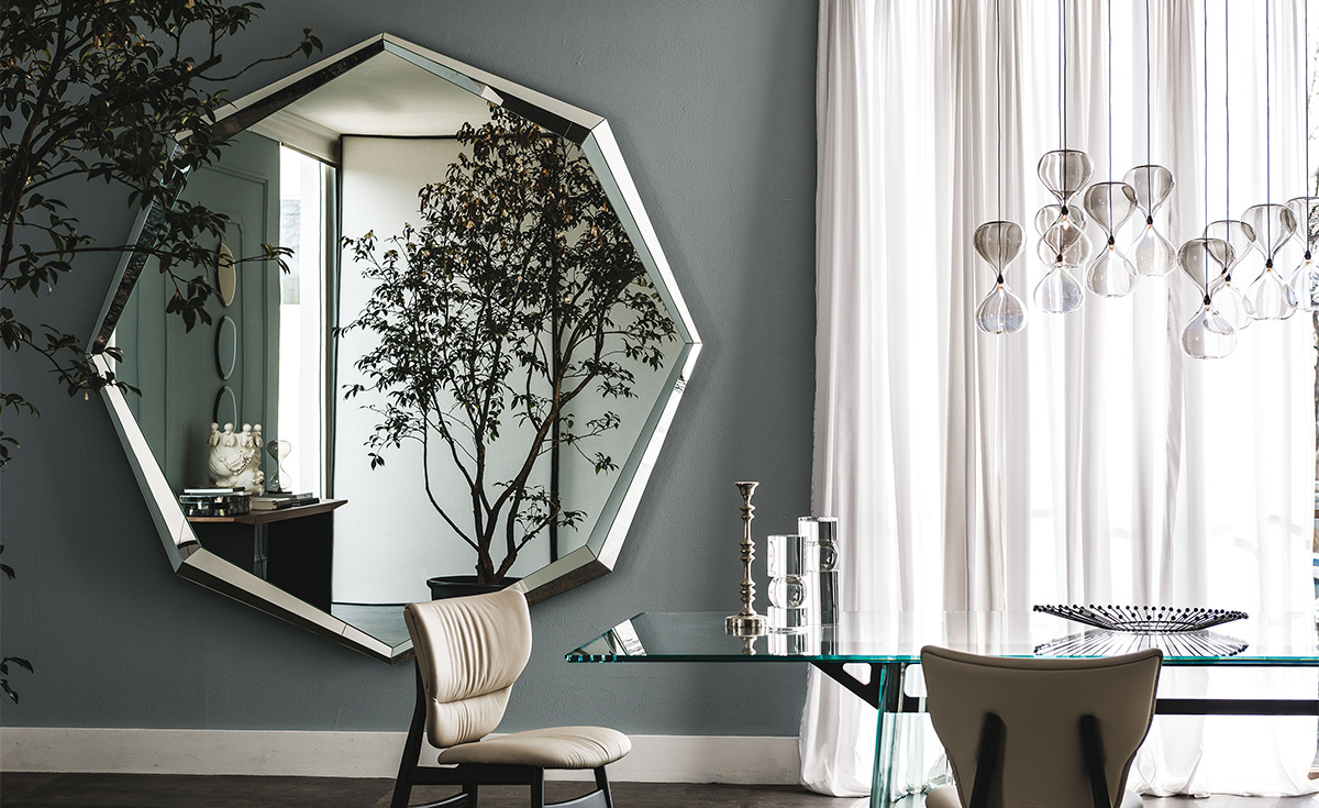Emerald es una familia de espejos de diseño con marco totalmente espejado. Su forma angular y su marco tridimensional recuerdan a una piedra preciosa y, como tal, refleja el entorno circundante en varios ángulos. El espejo de pared moderno Emerald tiene unas dimensiones considerables y está diseñado para decorar una pared, ampliando la habitación al mismo tiempo Emerald está disponible en forma circular o rectangular y en la versión Emerald Magnum alcanza los 2 metros de diámetro. El espejo también está disponible de vidrio fumè para darle a la habitación un efecto más íntimo y sofisticado.