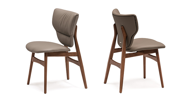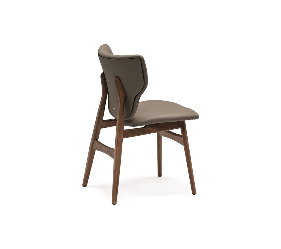 Silla con estructura en fresno barnizado nogal Canaletto (frNC), roble ahumado (frRB), fresno barnizado negro (fr73) mate a poro abierto. Asiento y respaldo tapizados en tejido, ecopiel o piel según muestrario. El tapizado no es desenfundable. (Disponible la versión taburete).