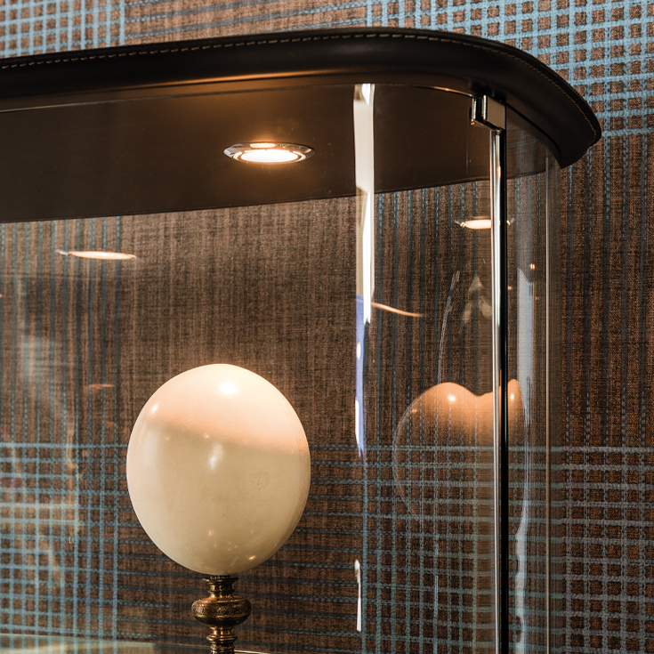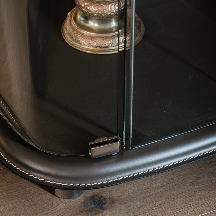 Concerto es una vitrina elegante de vidrio y cuero, con estructura y estantes de cristal extraclaro transparente. Un complemento de decoración elegante y refinado, que se destaca gracias al contraste entre el cristal y el cuero de la base y de la parte superior. El revestimiento de cuero permite atreverse con colores brillantes o buscar la armonía con tonalidades más delicadas. Esta vitrina de diseño contemporáneo se embellece gracias a las dos luces LED internas, que destacan los objetos que se guardan en su interior.