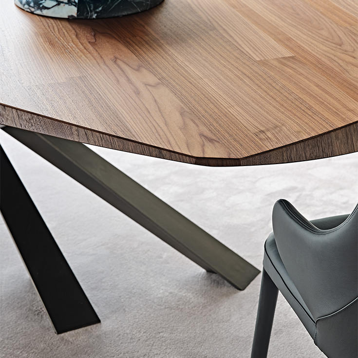 Mesa con base en acero barnizado gofrado titanio (GFM11), bronce (GFM18), graphite (GFM69), pearl (GFM70) o negro (GFM73), Brushed Bronze o Brushed Grey. Versión "B": sobre con bordes biselados en nogal Canaletto (NC) o roble ahumado (RB). Versión “Masterwood”: sobre en forma de barco en Nogal Canaletto (NC) o roble ahumado (RB) realizado con láminas de madera en posición diagonal. Cantos oblicuos y redondeados hacia abajo.