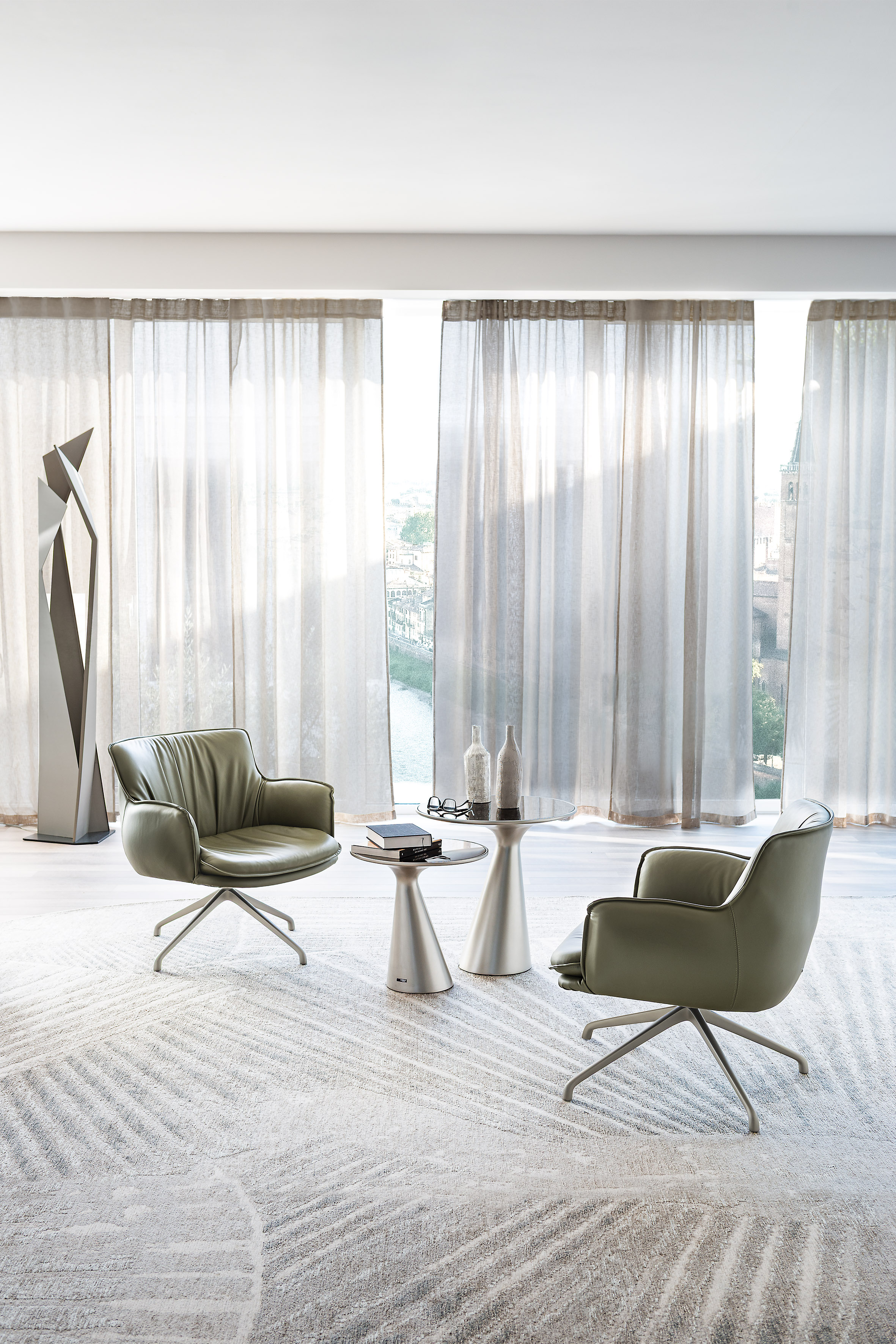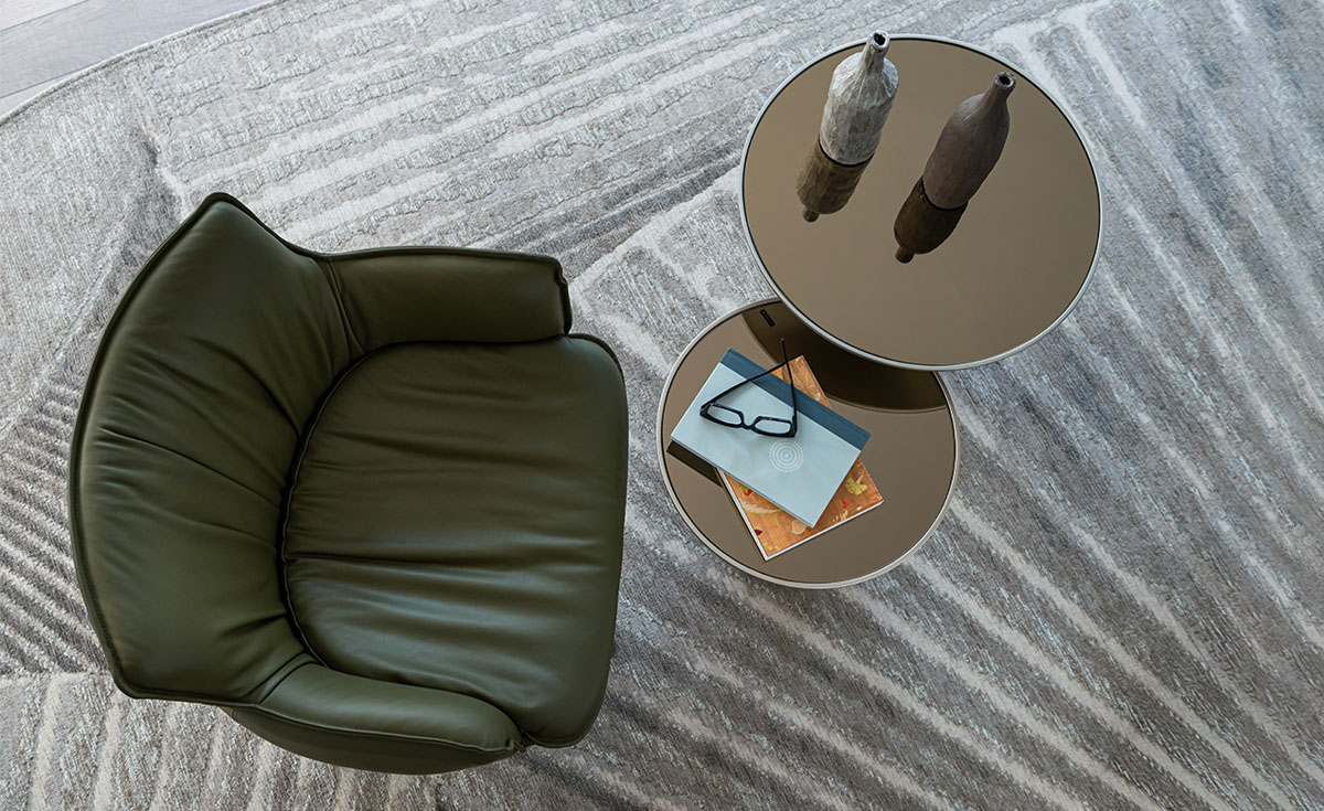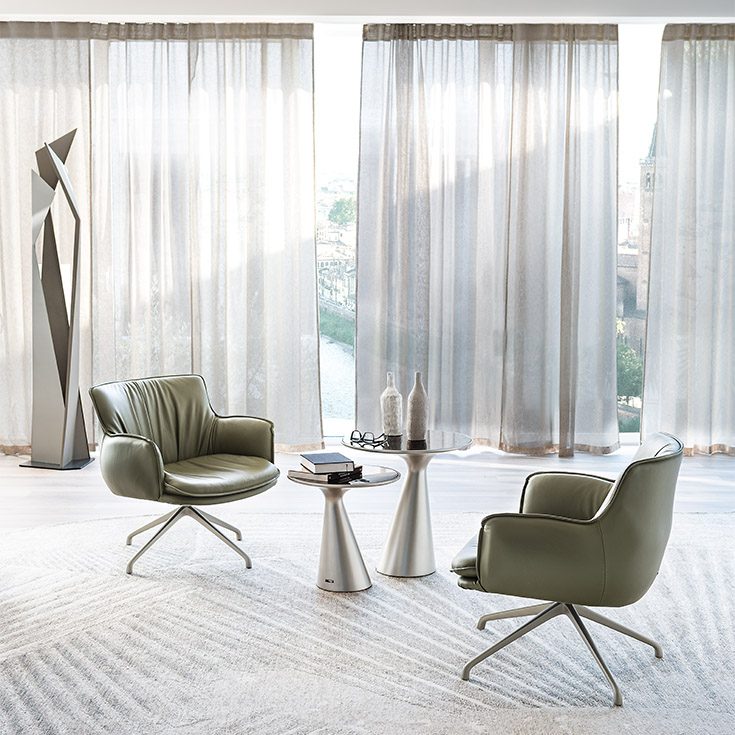 Sillón giratorio con base con 4 radios o fija en aluminio barnizado gofrado titanio (GFM11), bronce (GFM18), graphite (GFM69), pearl (GFM70) o negro (GFM73). Tapizada en tejido, micro nubuck, piel o ecopiel según muestrario. El tapizado no es desenfundable.