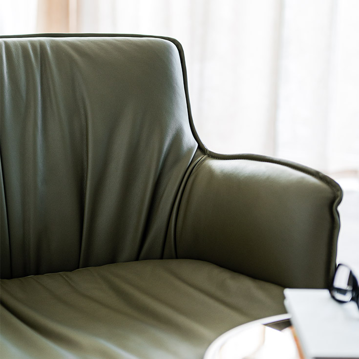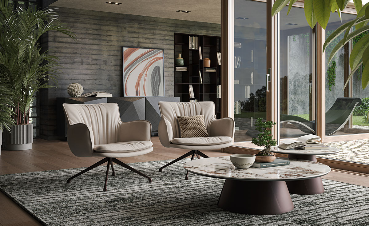 Por último, la familia se completa con la versión el moderno sillón giratorio Rhonda Lounge con su amplio asiento redondeado y su base giratoria que reducen sus generosas formas a lo esencial.
