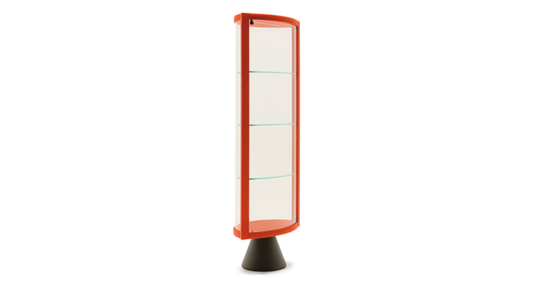La structure tournante, revêtue en cuir de première qualité, pivote sur la base en acier. Par contre, les portes et les étagères sont en cristal précieux extra clair. La courbure des deux portes n’est pas symétrique, afin de rendre cette vitrine tournante en verre encore plus originale.