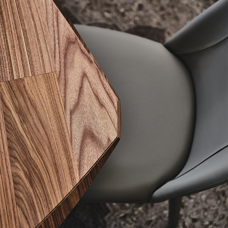 Table avec base en acier gaufré titane (GFM11), bronze (GFM18), graphite (GFM69) ou noir (GFM73), Brushed Bronze ou Brushed Grey. Version "S": plateau en noyer Canaletto (NC), rouvre brulé (RB) ou rouvre naturel (RN) avec bords irréguliers en bois massif. Version "B": plateau avec bords biseauté en noyer Canaletto (NC) ou rouvre brulé (RB). Version “Masterwood” plateau en forme de bateau en noyer Canaletto (NC) ou rouvre brulé (RB) réalisé avec des planches de bois de différentes dimensions placées en diagonale. Bords obliques et arrondis. Version "Y" : plateau avec bords biseautés en noyer Canaletto (NC) avec détails en rouvre brulé ou rouvre brulé (RB) avec détails en noyer Canaletto. Les variations chromatiques et de brossage de la finition Brushed sont les caractéristiques de la production artisanale et donc ne sont pas considérés comme défauts.
