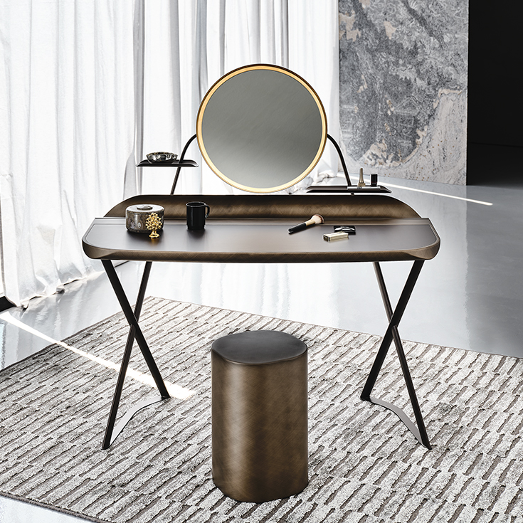 Coiffeuse avec base en acier gaufré titane (GFM11), bronze (GFM18) ou noir (GFM73). Top en cuir selon les échantillons avec profil inférieur arrondi laqué Brushed Bronze ou Brushed Grey. Miroir avec structure en acier lacqué gaufrè titane (GFM11), bronze (GFM18) ou noir (GFM73), Brushed Bronze ou Brushed Greyavec supports latéraux et étagères en acier lacqué gaufré titane (GFM11), bronze (GFM18) ou noir (GFM73) et éclairage à led.