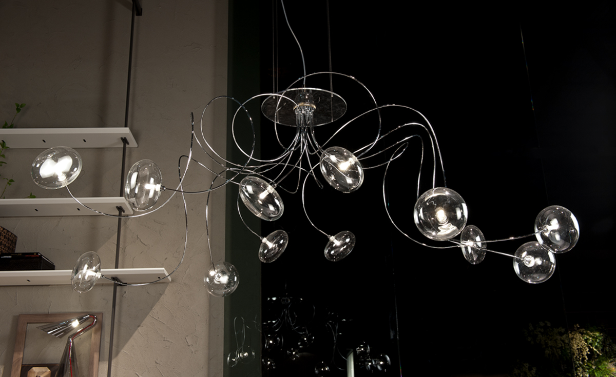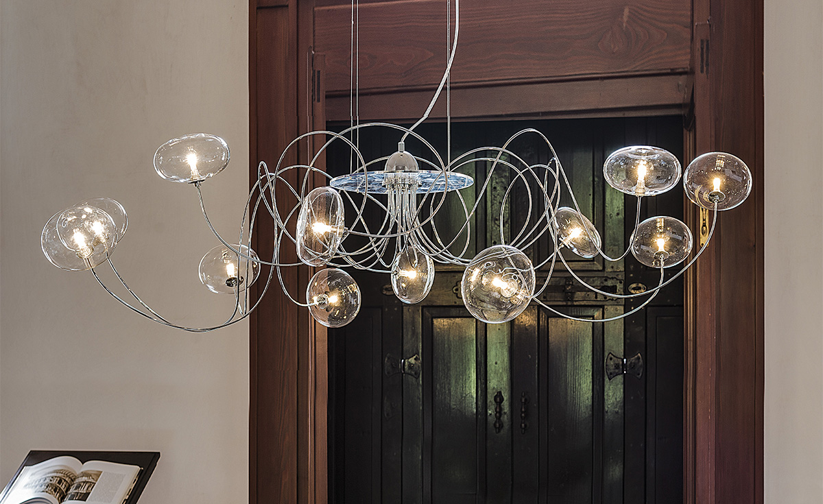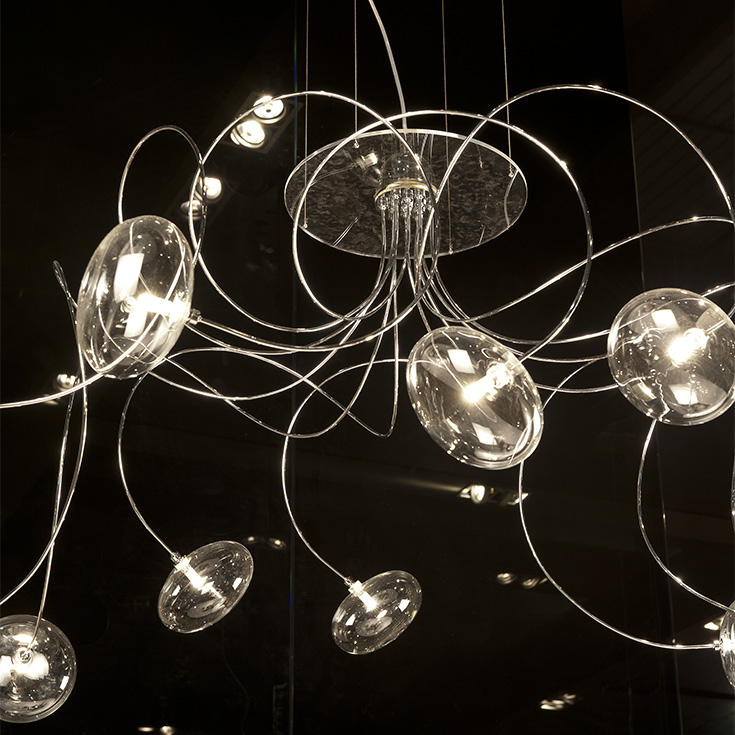 Le luminaire moderne Oktopus est un spectacle d’abat-jour en cristal qui semblent prendre vie à l’extrémité de tentacules en métal, qui flottent sinueusement dans l’air.Le luminaire de design Oktopus est une chorégraphie tridimensionnelle, riche de détails, qui éclaire de manière uniforme en enrichissant l’espace environnant avec un design original et sans temps.