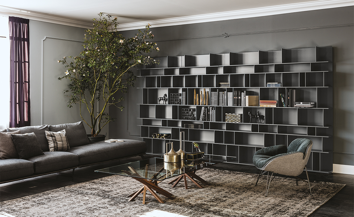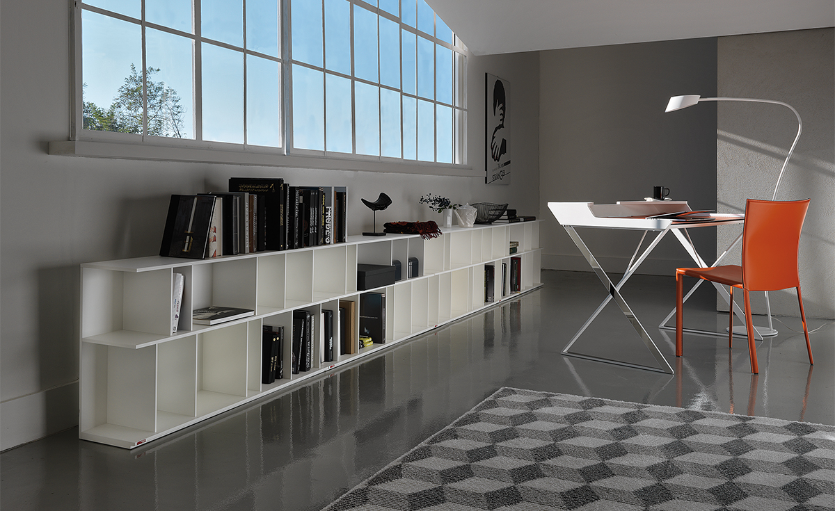 Bibliothèque modulable en MDF gaufré titane (GF11), graphite (GF69) ou blanc (GF71). Capacité maximum: kg 60 (105), kg 45 (65), kg 40 (B) divisée sur toutes les étagères. Fixation au mur nécessaire.