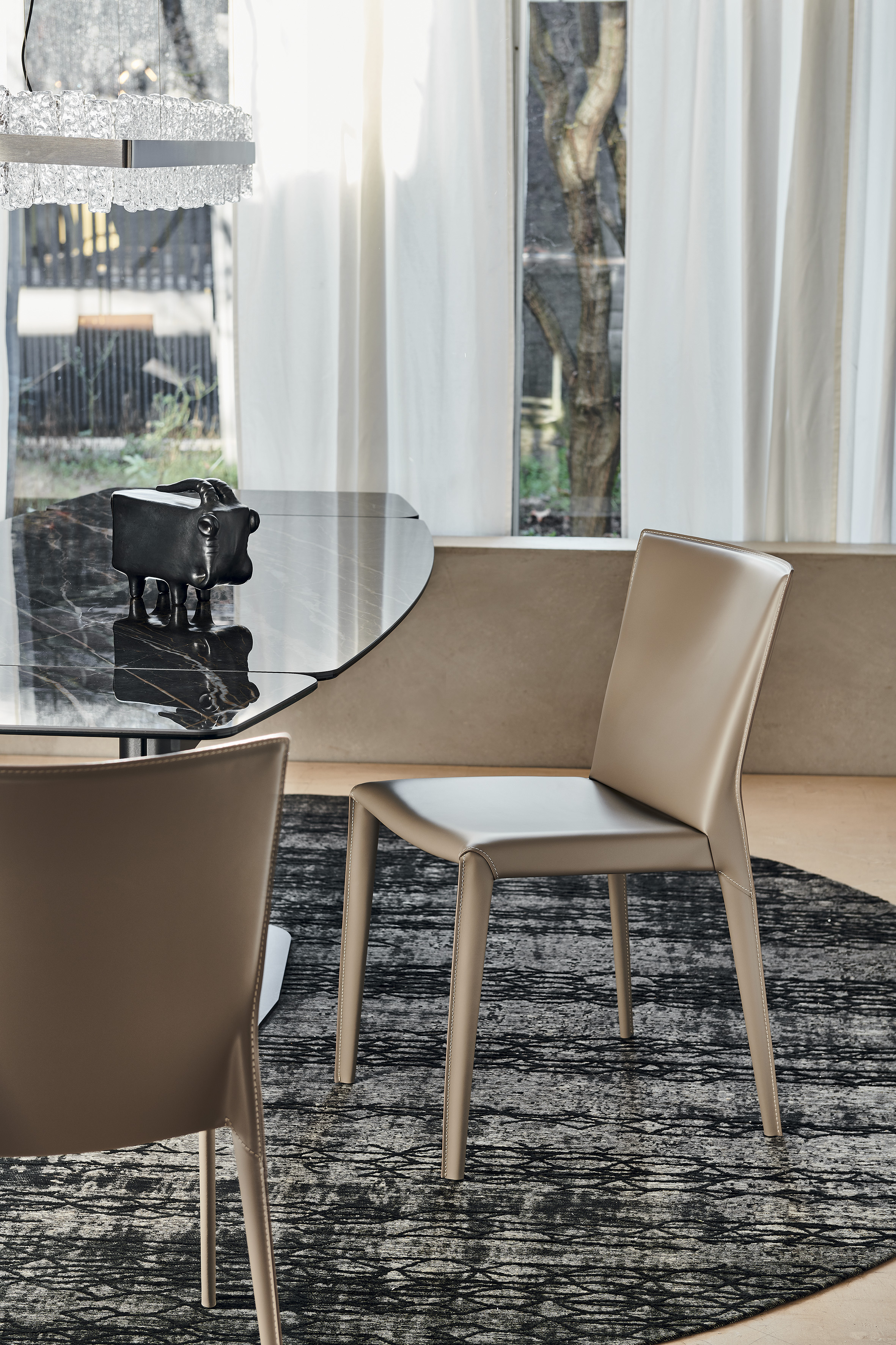 Chaise avec structure en acier. Revêtement en cuir selon échantillons. Coutures standard ou en contrast.