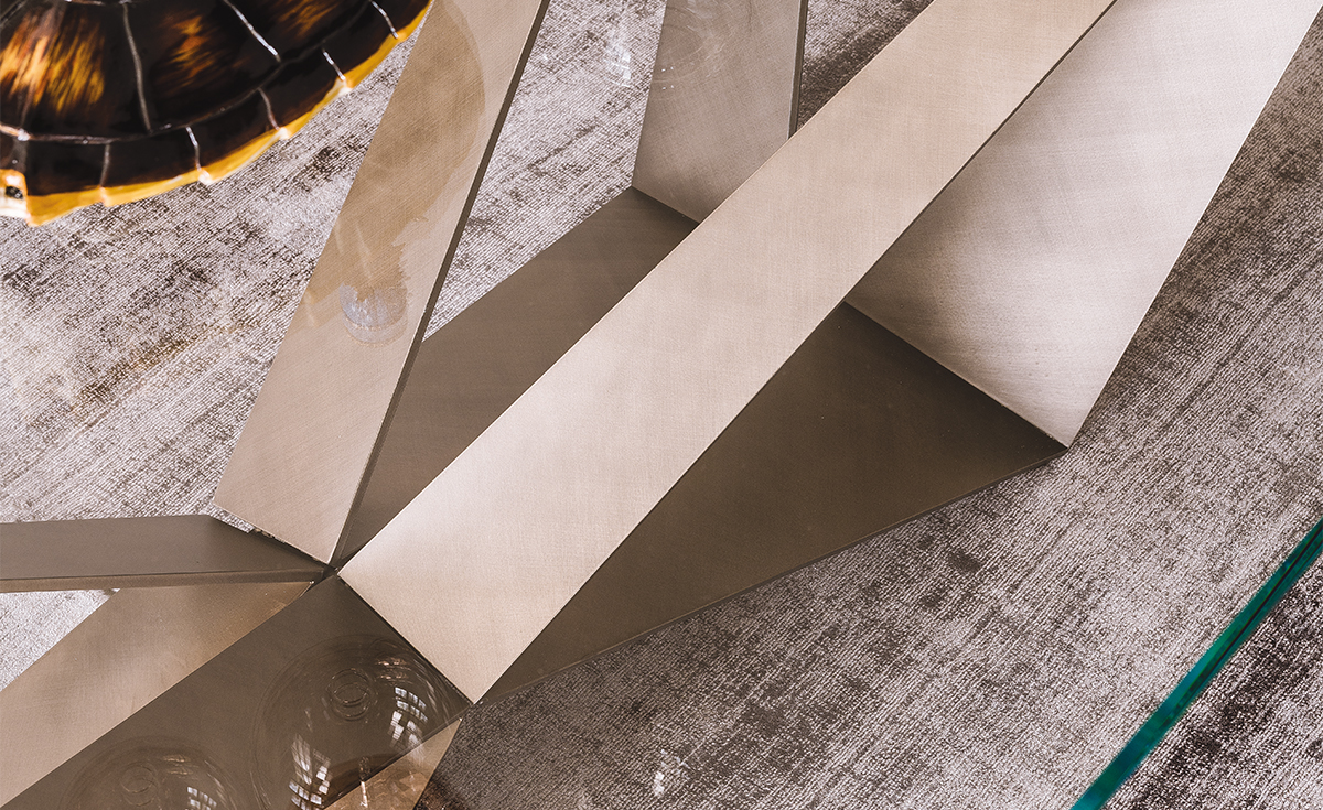 Table avec base en acier laqué gaufré titane (GFM11), bronze (GFM18), graphite (GFM69), pearl (GFM70) ou noir (GFM73), Brushed Bronze ou Brushed Grey. Plateau en verre clair 15 mm, extra-clair ou extra-clair avec bords biseautés, biseautés inversés ou en verre cuit (MIST). Les plateaux 160x90, 182x90 et 200x106 sont de 12mm. Plateau en appui. Les variations chromatiques et de brossage de la finition Brushed sont les caractéristiques de la production artisanale et donc ne sont pas considérés comme défauts.