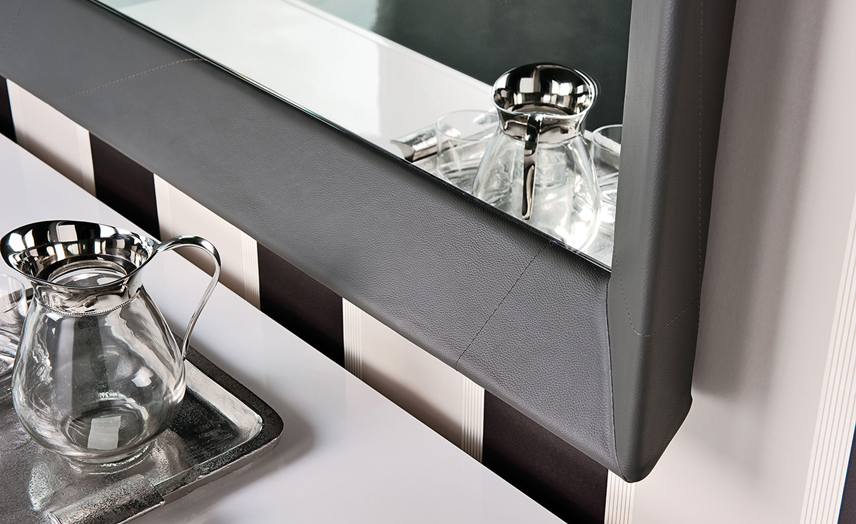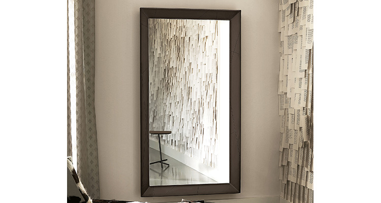 La famille de miroirs modernes Taxedo se distingue par le cadre entièrement revêtu, qui présente des coutures en diagonale créant du dynamisme, en s’opposant à la forme régulière du miroir.