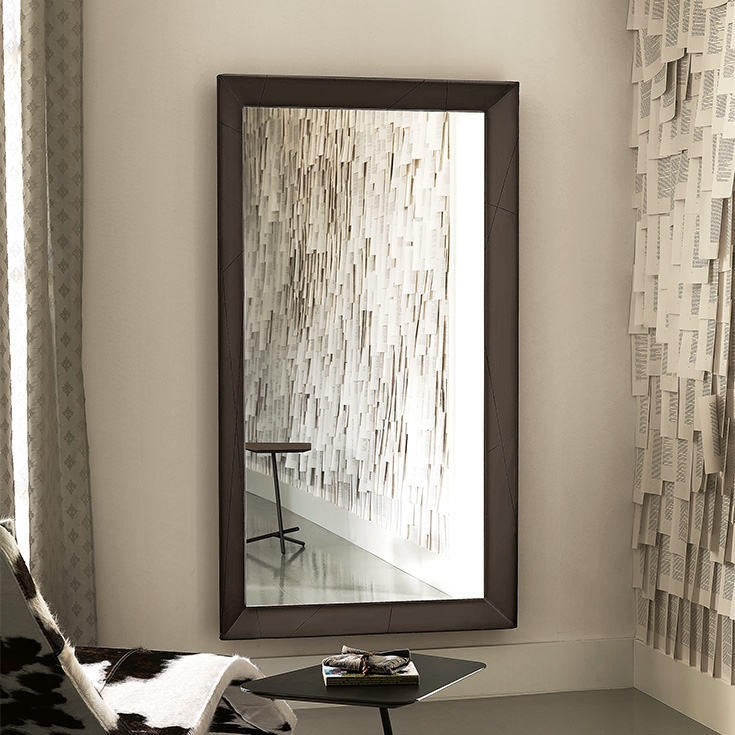 Miroir de mur ou de sol en verre miroité ou miroité fumé avec cadre revêtu en simili cuir ou cuir mince selon échantillons. Le miroir est équipé de supports pour le montage horizontal ou vertical.