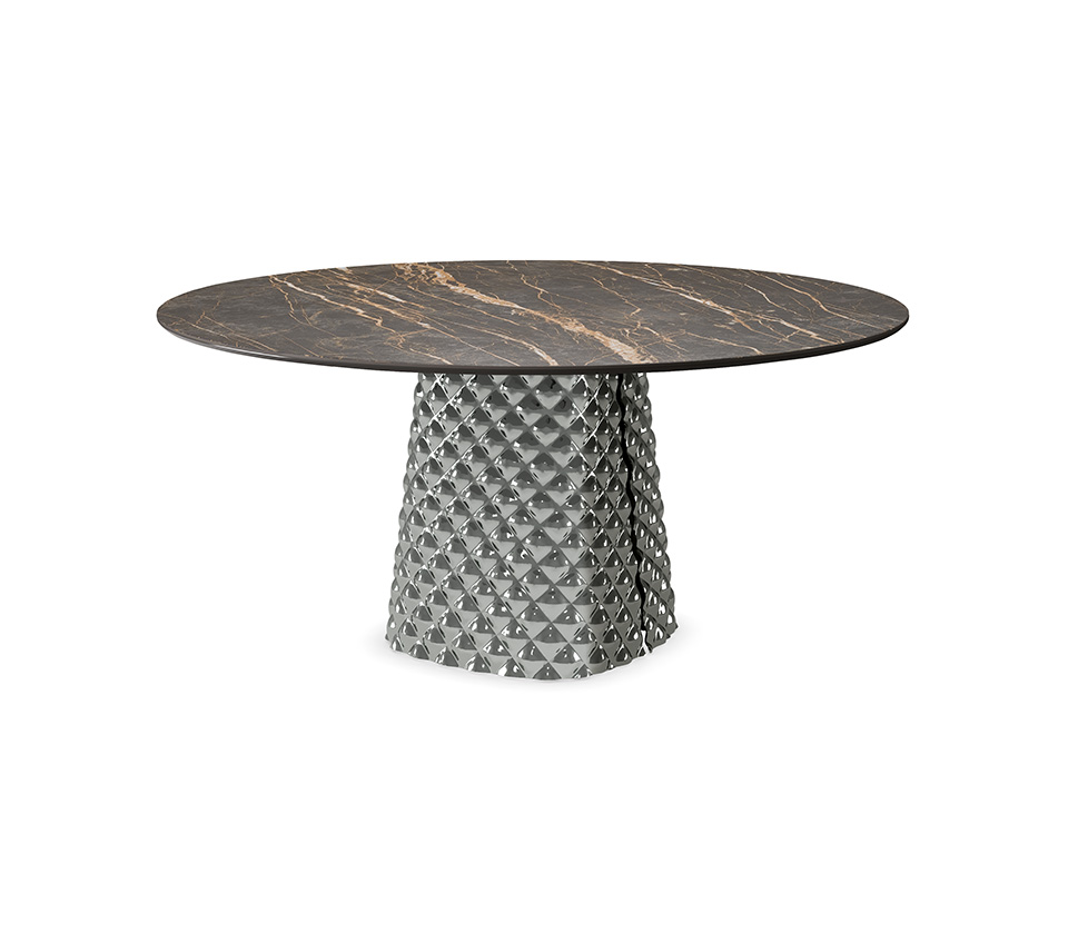 La base centrale est constituée de deux plaques en cristal réfléchissant couture, délicatement exécutées. La table crée un jeu de réflexions tamisées, où les objets et les sources de lumière environnants se reflètent. Le cristal est modelé avec une technique sans précédent, qui permet de donner un effet tridimensionnel à la surface, comme un matelassage sur tissu.