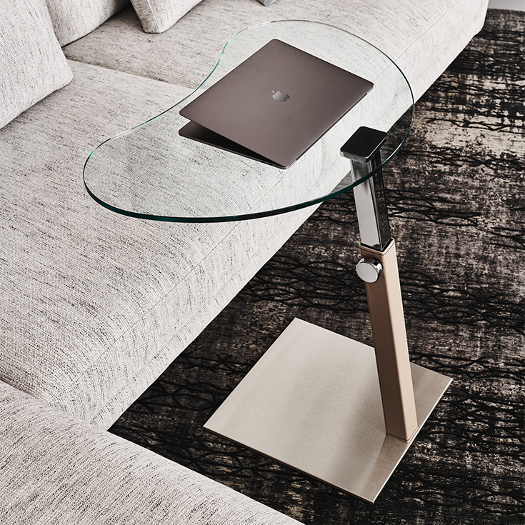 Table coté/canapé ou porte-ordinateur réglable en hauteur. Plateau en verre clair 12mm rectangulaire ou façonné. Base en acier inox satiné avec pied chromé ou revêtu en cuir selon échantillons.