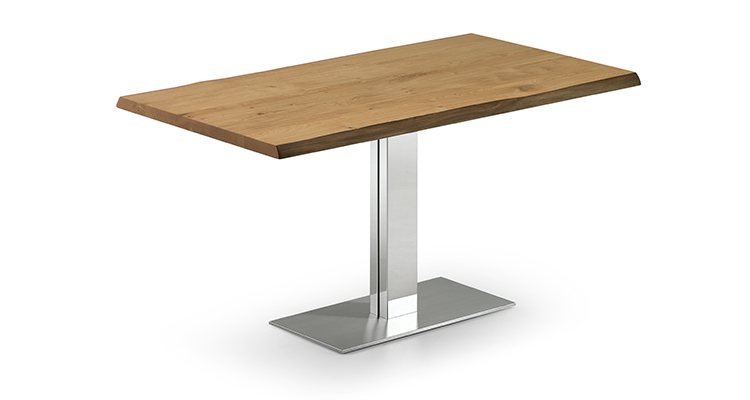 Table avec base en acier inox satiné et colonne en en acier inox brillant ou gaufré titane (GFM11) ou graphite (GFM69). S version plateau en noyer Canaletto (NC), rouvre brulé (RB) ou rouvre naturel (RN) avec des bords irréguliers en bois massif.