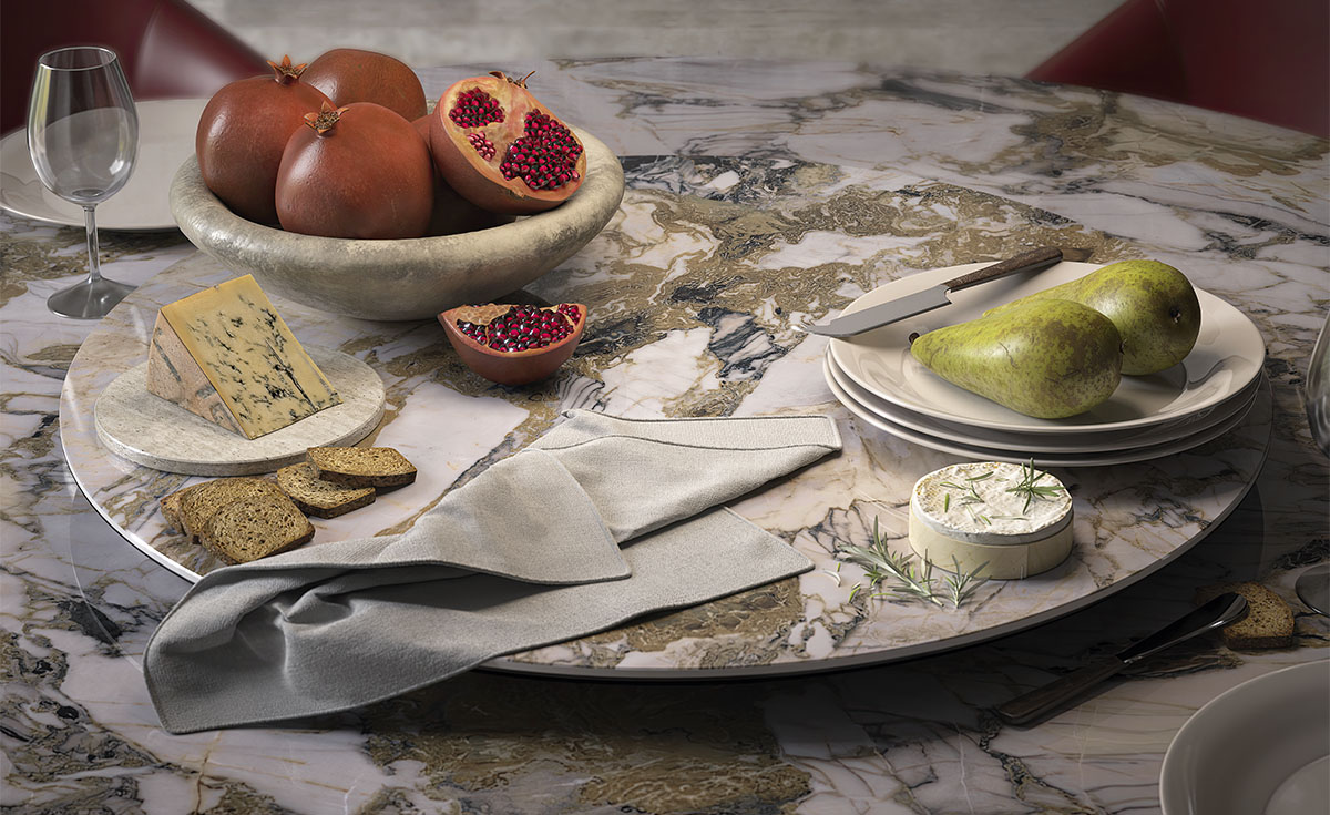 Plateau centre table pivotant en céramique Marmi dans les couleurs Alabastro (KM02), Makalu (KM11) ou Colosseo (KM21).