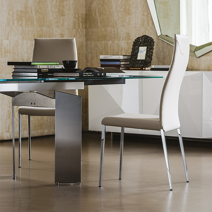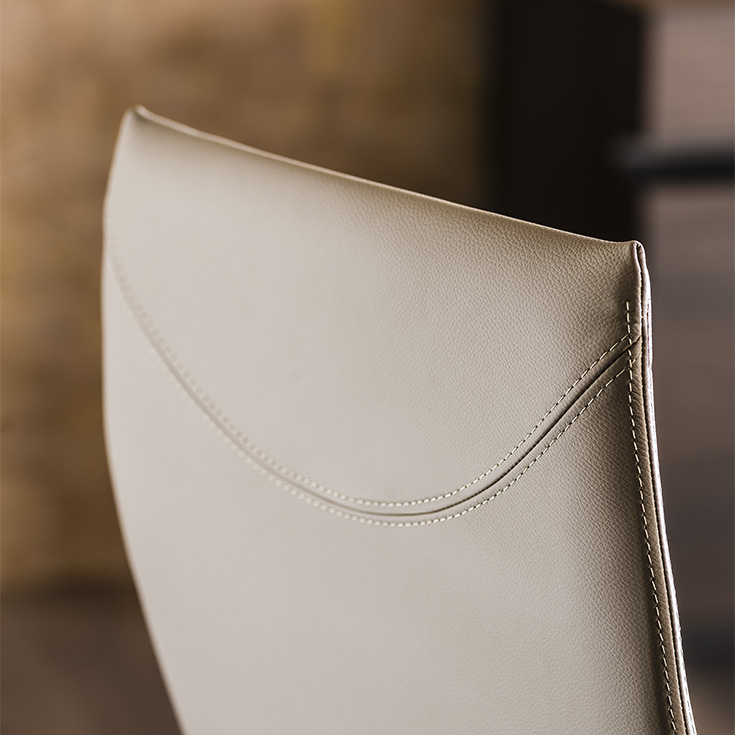 La large gamme de revêtements permet de personnaliser ces assises en assortissant les nuances des cuirs et des tissus aux finitions du piètement.