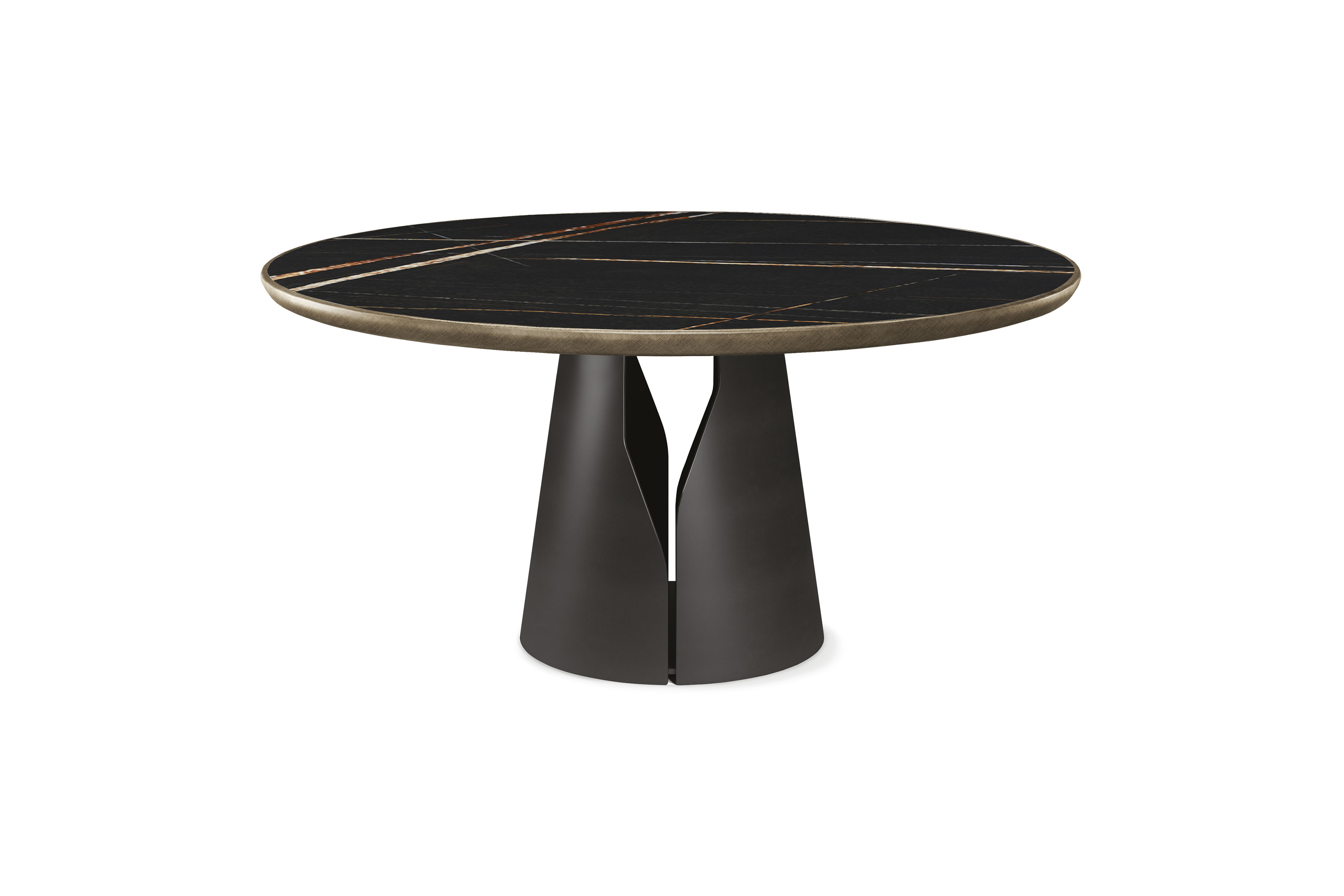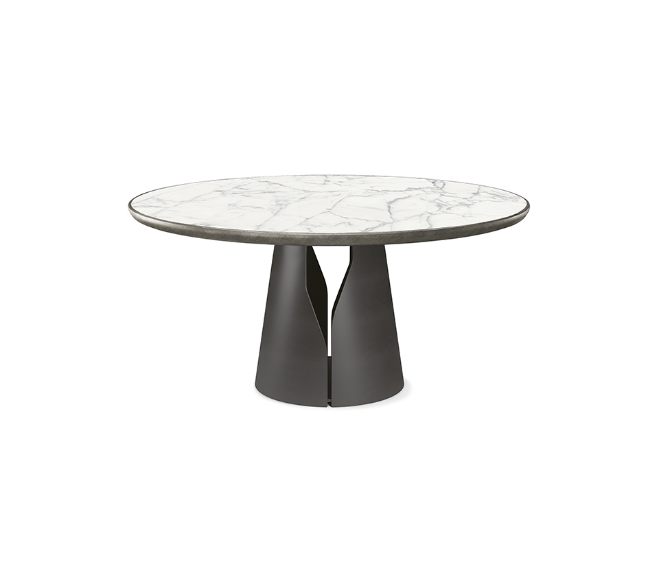 Tavolo con base in acciaio verniciato goffrato titanio (GFM11), bronzo (GFM18), graphite (GFM69), pearl (GFM70) o nero (GFM73). Piano in ceramica Marmi nei colori Alabastro (KM02), Golden Calacatta opaco (KM05), Golden Calacatta lucido (KM06), Portoro opaco (KM07), Portoro lucido (KM08), Sahara Noir lucido (KM09), Makalu (KM11), Breccia (KM12), Borghini Calacatta opaco (KM18), Colosseo (KM21), Andromeda (KM22), Invisible opaco (KM24) o Luxor (KS23) con profilo inferiore arrotondato e verniciato Brushed Bronze o Brushed Grey. Variazioni cromatiche e di spazzolatura della finitura Brushed sono caratteristiche della lavorazione artigianale e non sono da considerarsi difetti.