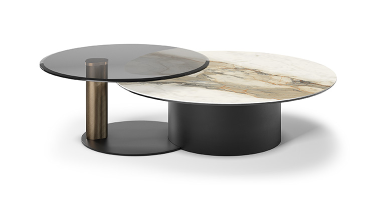 Tavolino con base in metallo verniciato goffrato nero (GFM73). Piano in ceramica Marmi nei colori Golden Calacatta opaco (KM05), Golden Calacatta lucido (KM06), Portoro opaco (KM07), Portoro lucido (KM08), Breccia (KM12), Corcovado (KM14), Kaindy (KM16), Borghini Calacatta opaco (KM18), Borghini Calacatta lucido (KM19), Colosseo (KM21), Andromeda (KM22), Invisible opaco (KM24) o Luxor (KS23). Il tavolino principale è affiancato da un tavolino con base in acciaio verniciato goffrato nero (GFM73), colonna in acciaio verniciato Brushed Bronze o Brushed Grey e piano girevole in cristallo bisellato fumé o bronzo. Variazioni cromatiche e di spazzolatura della finitura Brushed sono caratteristiche della lavorazione artigianale e non sono da considerarsi difetti.
