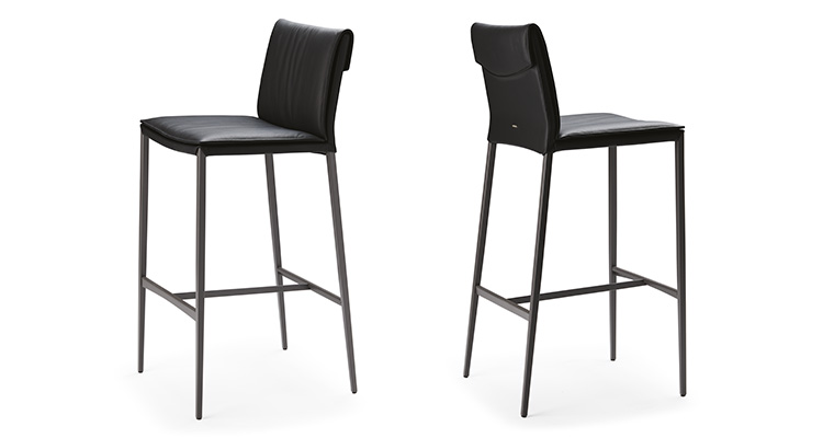 Sgabello con struttura in acciaio verniciato opaco graphite (OP69), goffrato titanio (GFM11), bronzo (GFM18) o pearl (GFM70). Cuscini imbottiti e rivestimento in tessuto, micro nubuck, ecopelle o pelle come da campionario. Il rivestimento non è sfoderabile.