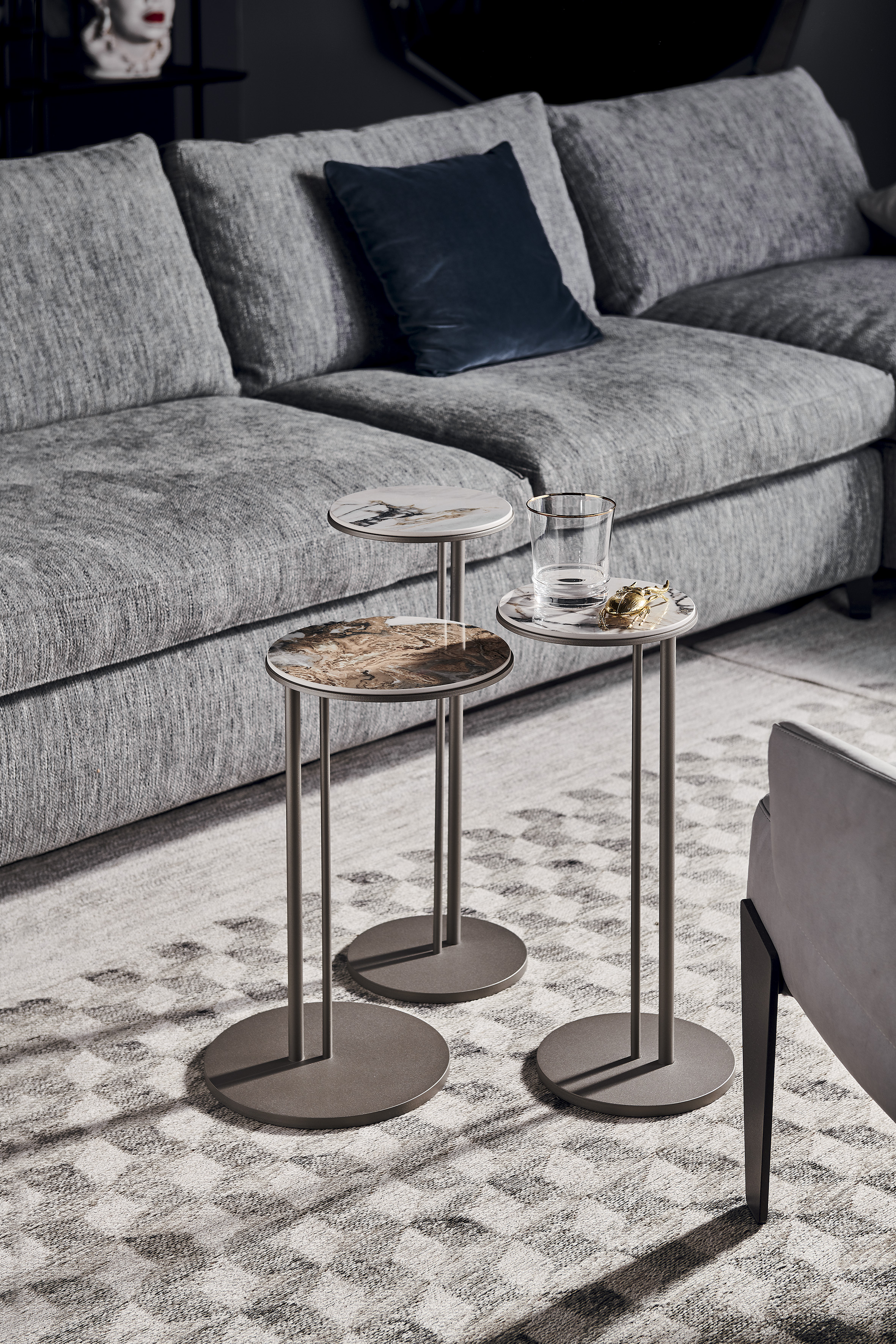 Tavolino con base in acciaio verniciato goffrato titanio (GFM11), bronzo (GFM18), graphite (GFM69), pearl (GFM70) o nero (GFM73). Piano in ceramica Marmi nei colori Portoro opaco (KM07), Portoro lucido (KM08), Makalu (KM11), Breccia (KM12), Kaindy (KM16) o Colosseo (KM21).