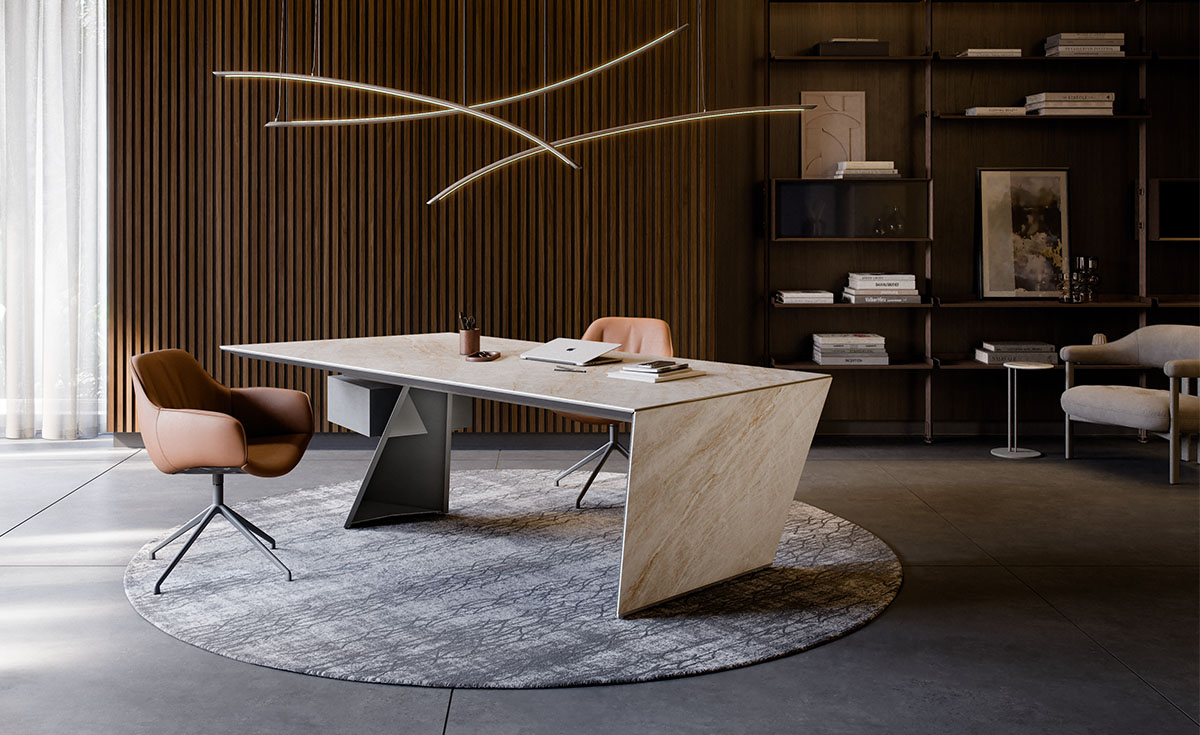La scrivania da ufficio Nasdaq Keramik è una composizione di geometrie e materiali, dall’effetto monolite. La cassettiera in legno sfida la gravità, poggiata sulla gamba in acciaio, che incide lo spazio con una diagonale decisa. La finitura del piano in ceramica Marmi presenta una vena continua, tra la parte superiore e quella laterale, che esalta l’identità architettonica dello scrittoio.