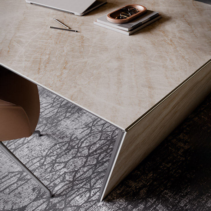 Scrivania in ceramica Marmi nei colori Alabastro (KM02), Golden Calacatta opaco (KM05), Golden Calacatta lucido (KM06), Portoro opaco (KM07), Portoro lucido (KM08), Sahara Noir lucido (KM09), Makalu (KM11), Breccia (KM12), Corcovado (KM14), Kaindy (KM16), Borghini Calacatta opaco (KM18), Borghini Calacatta lucido (KM19), Colosseo (KM21), Andromeda (KM22), Invisible opaco (KM24), Taj Mahal (KM26) o Luxor (KS23) con inserto in cromo nero (06). Gamba in acciaio verniciato goffrato graphite (GFM69), titanio (GFM11) e bronzo (GFM18), struttura e cassettiera in legno verniciati in tinta con la gamba. Pad in cuoio nei colori come da campionario.