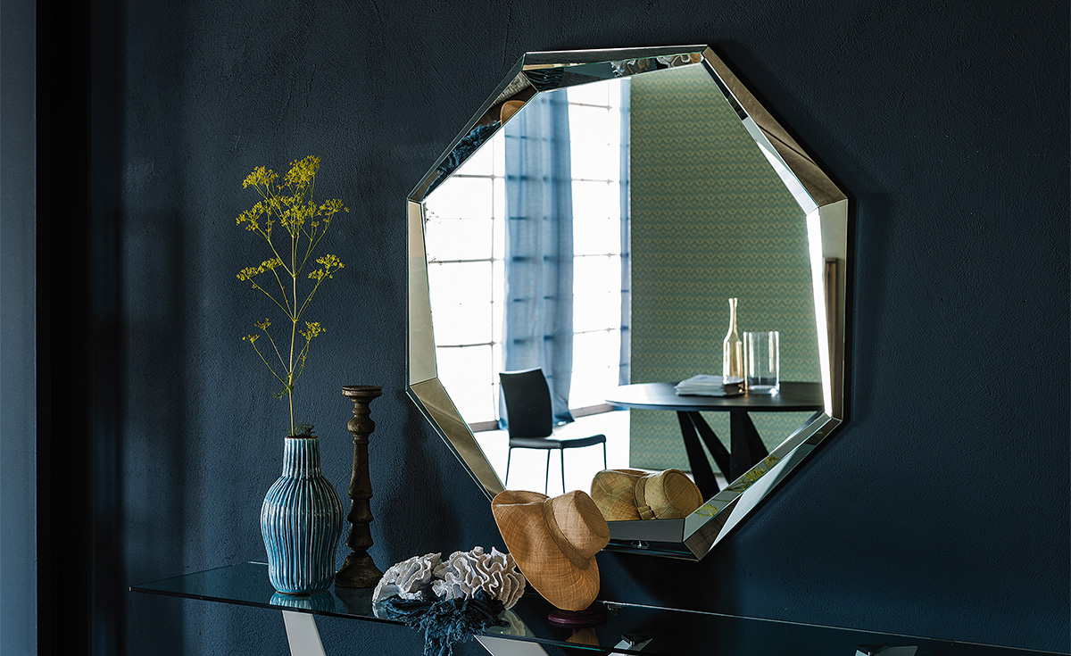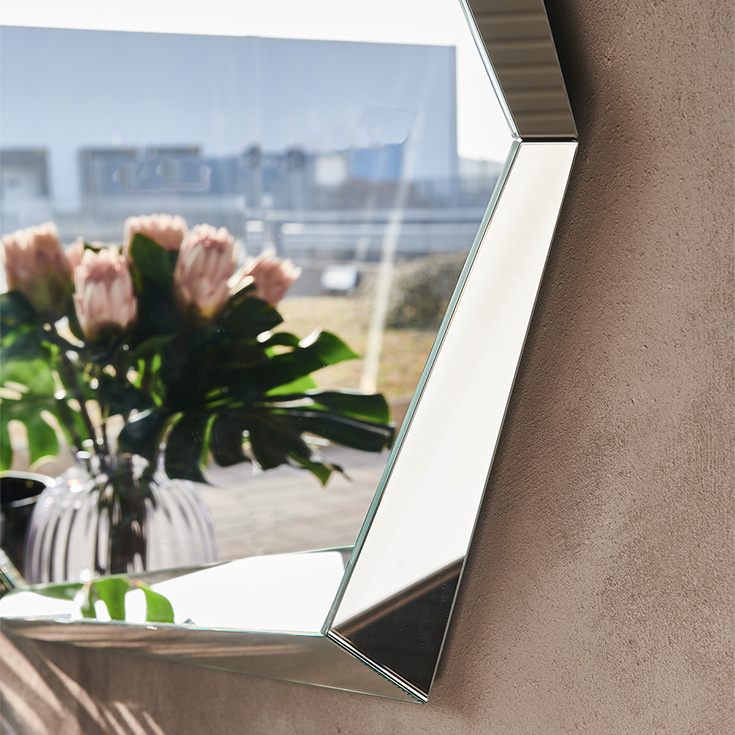 Emerald è una famiglia di specchi di design con cornice interamente specchiata. La sua forma spigolosa e la cornice tridimensionale ricordano una pietra preziosa e come tale, riflette l'ambiente circostante con varie angolazioni. Lo specchio a parete moderno Emerald ha notevoli dimensioni ed è pensato per decorare una parete, ampliando la stanza allo stesso tempo. Emerald è disponibile in forma circolare o rettangolare e nella versione Emerald Magnum raggiunge 2 metri di diametro. Lo specchio è disponibile anche in vetro fumè per dare alla sala un effetto più intimo e sofisticato.