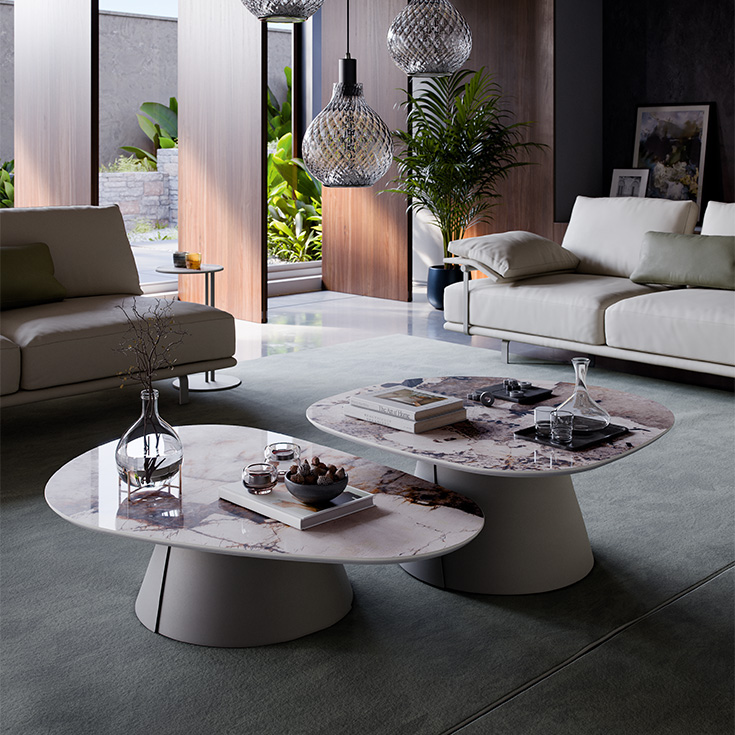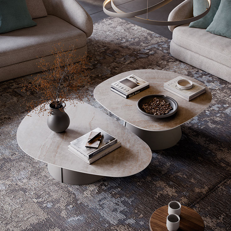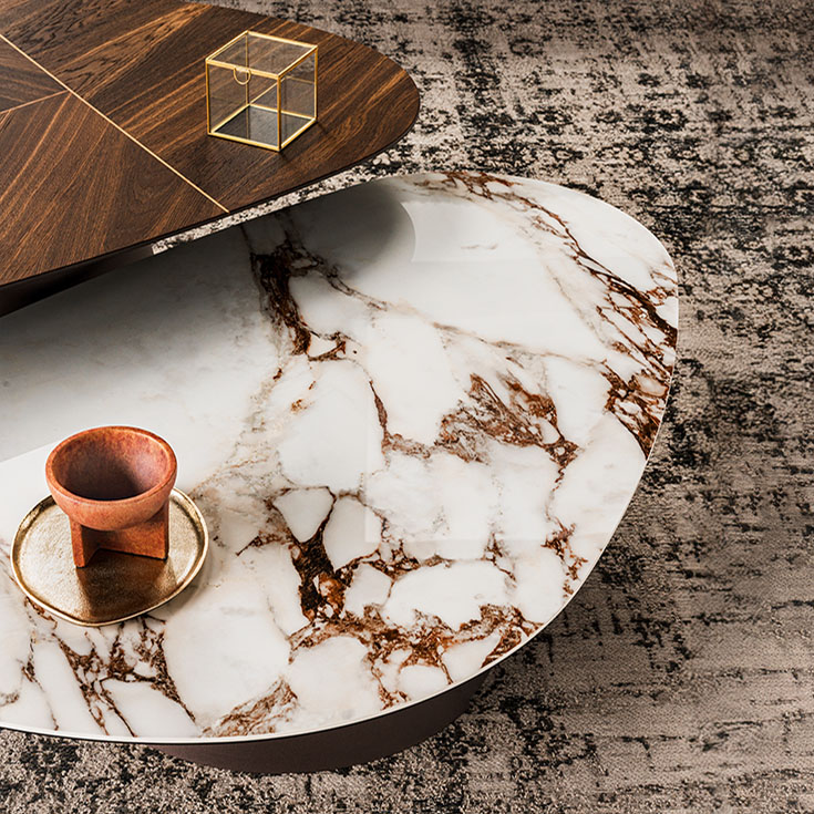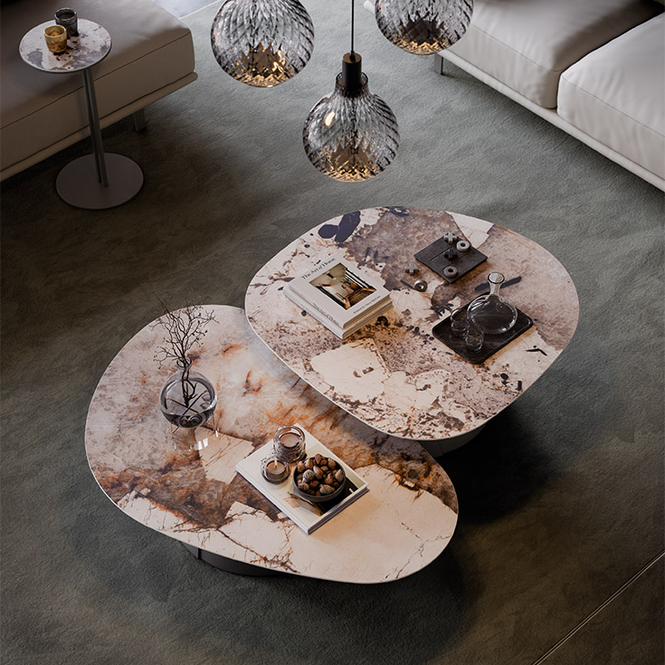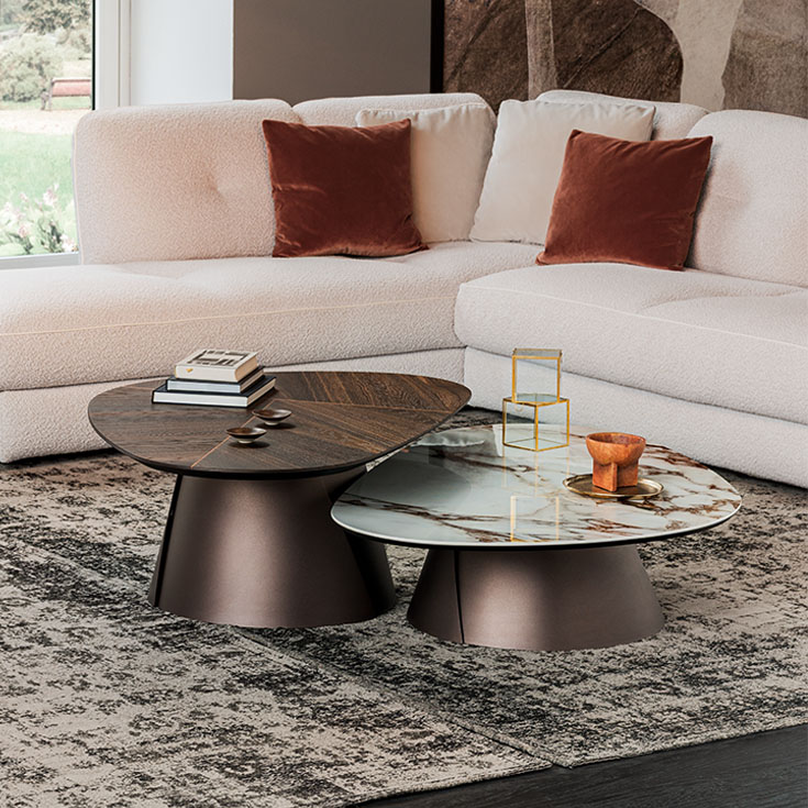 Tavolino con base in metallo verniciato goffrato titanio (GFM11), bronzo (GFM18) o pearl (GFM70). Piano in ceramica Marmi nei colori Golden Calacatta opaco (KM05), Golden Calacatta lucido (KM06), Portoro opaco (KM07), Portoro lucido (KM08), Breccia (KM12), Corcovado (KM14), Kaindy (KM16), Borghini Calacatta opaco (KM18), Borghini Calacatta lucido (KM19), Colosseo (KM21), Andromeda (KM22), Invisible opaco (KM24), Taj Mahal (KM26) o Luxor (KS23).
