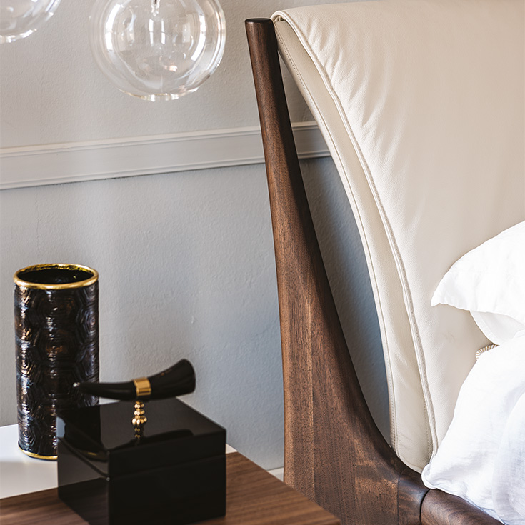 Letto con struttura in legno noce Canaletto (NC) o frassino tinto rovere bruciato (frRB). Testiera interamente rivestita in tessuto, micro nubuck, ecopelle o pelle nei colori come da campionario. Rete inclusa.