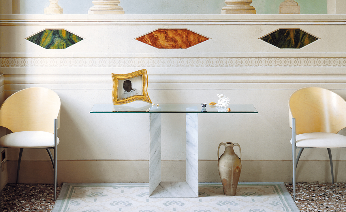 Consolle con base in Travertino (TN) o bianco Carrara (BC) e piano in cristallo trasparente 12mm. Piano in appoggio.