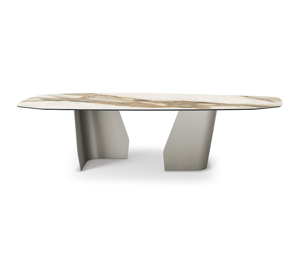 Tavolo con base in acciaio verniciato goffrato titanio (GFM11) o bronzo (GFM18). Piano in ceramica Marmi nei colori Alabastro (KM02), Golden Calacatta opaco (KM05), Golden Calacatta lucido (KM06), Portoro opaco (KM07), Portoro lucido (KM08), Sahara Noir lucido (KM09), Makalu (KM11), Breccia (KM12), Corcovado (KM14), Kaindy (KM16), Borghini Calacatta opaco (KM18), Borghini Calacatta lucido (KM19), Colosseo (KM21), Andromeda (KM22), Invisible opaco (KM24) o Luxor (KS23). Piano in appoggio.