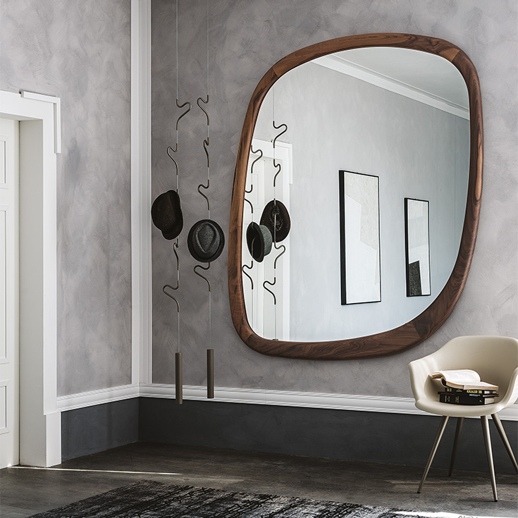 Specchio da parete con cornice in noce Canaletto (NC) o rovere bruciato (RB). Supporto a parete con possibilità di fissaggio in diverse posizioni.