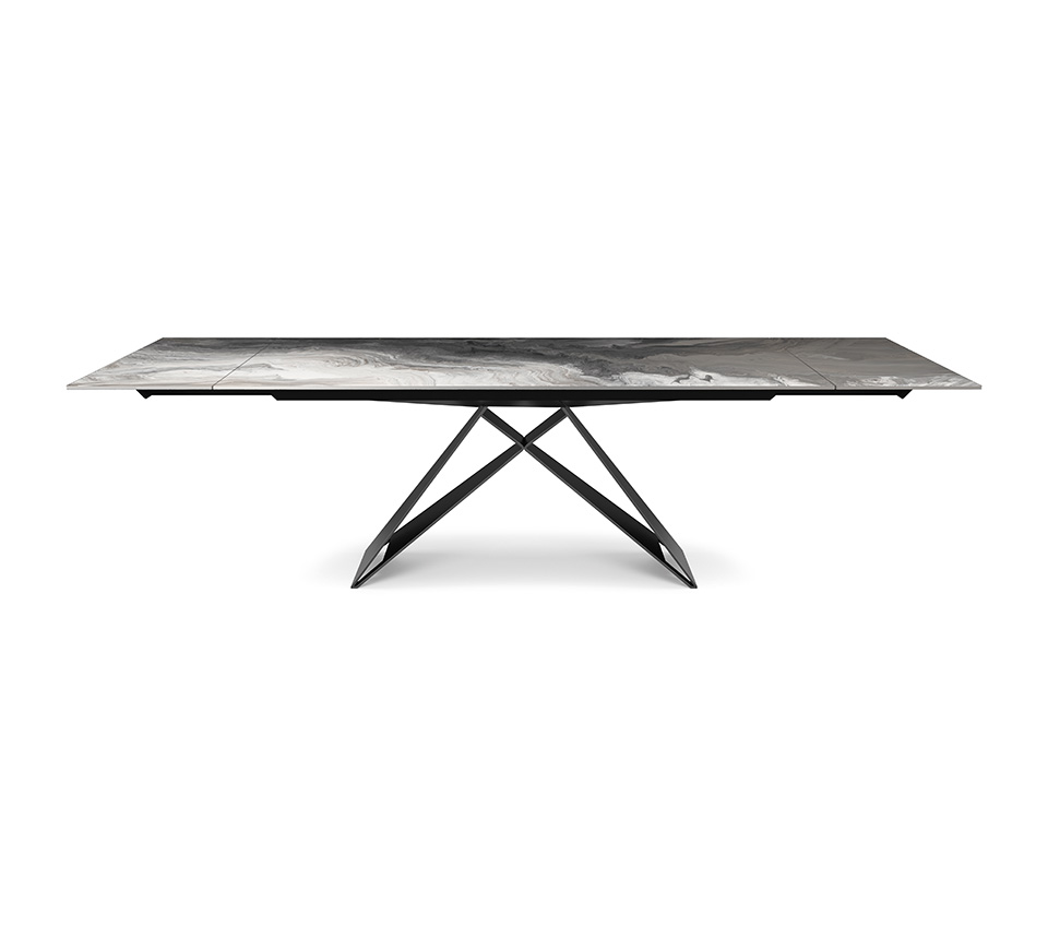 Tavolo allungabile con base in acciaio verniciato goffrato titanio (GFM11), bronzo (GFM18), graphite (GFM69) o nero (GFM73). Piano e prolunghe in cristallo 12mm extrachiaro con stampa artistica decorativa in quattro varianti colore (CY01, CY02, CYM6 Cotopaxi, CYM7 Orobico).