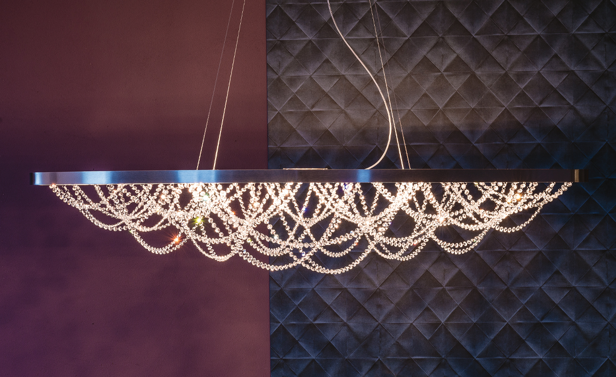 Элегантная дизайнерская люстра Cristal состоит из никелевого бортика, к которому прикреплены цепочки с хрустальными подвесками, которые перекрещиваются с шармом и элегантностью, как ювелирное украшение.