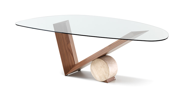 Стол с основанием из ореха Canaletto (NC), или обоженного дуба (RB), цилиндром из мрамора Travertino (TN), белого мрамора Carrara (BC), или черного мрамора Marquinia (NM). Столешница из прозрачного стекла 15 мм. Закругленная столешница размера 240x115 имеет толщину 12 мм.
