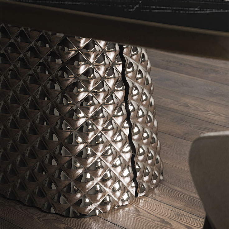 Центральная база состоит из двух зеркальных, изящно обработанных, стеклянных пластин от кутюр. Стол создает игру приглушенных отражений из окружающих предметов и источников света. Стекло создается при помощи удивительной технологии, которая позволяет придать поверхности трехмерный эффект простежки на материале.