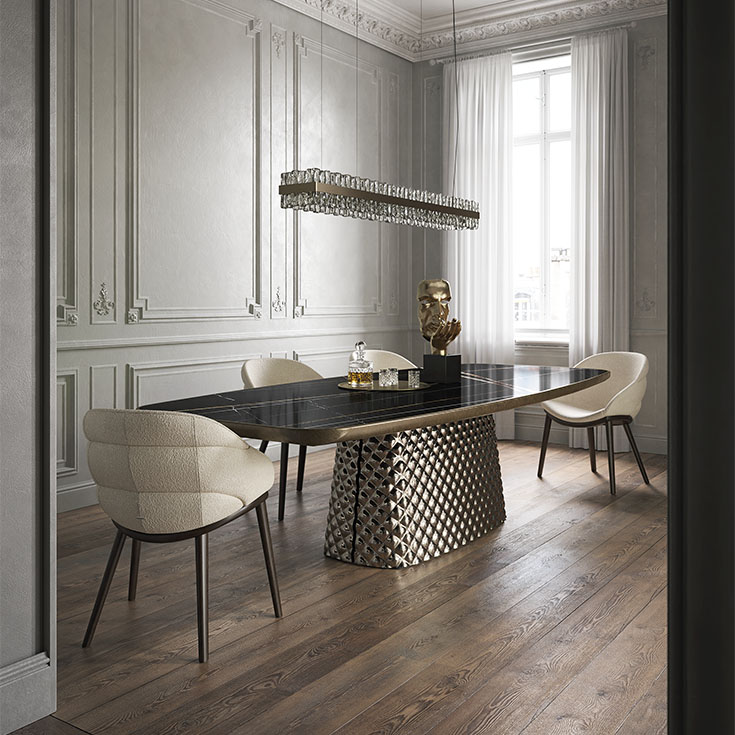 Стол с изогнутым стеклянным основанием, с эффектом "стеганного зеркального полотна", дымчатым или бронзовым. Верх выполнен из керамики в отделках Alabastro (KM02), Golden Calacatta opaco (KM05), Golden Calacatta lucido (KM06), Portoro opaco (KM07), Portoro lucido (KM08), Sahara Noir lucido (KM09), Makalu (KM11), Breccia (KM12), Borghini Calacatta opaco (KM18), Borghini Calacatta lucido (KM19), Colosseo (KM21), Andromeda (KM22), Invisible opaco (KM24) или Luxor (KS23) c нижним загругленным профилем, окрашенным в Brushed Bronze или Brushed Grey. Цветовые и брашировочные колебания отделки Brushed являются характерными для изготовлений ручным способом и не должны расцениваться как дефекты.
