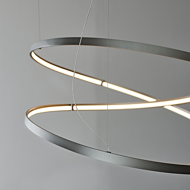 Потолочный светильник со структурой из стали, окрашенной в гофрированный титан (GFM11). С LED освещением. Доступен в версии с постоянным светом, опционально комплектуется пультом дистанционного управления и приемником для регулировки яркости света или с регулировкой яркости в системе DALI / PUSH 1-10 V / PUSH 0-10 V.