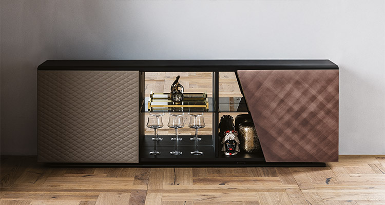 Комод из дерева, лакированном в гофрированный черный (GF73) и базой из стали, окрашенной в гофрированный черный (GFM73). Левый фасад обит натуральной или синтетической простроченной кожей цветов согласно образцам, с профилями из аллюминия окрашенного в гофрированный титан (GFM11). Правый фасад в брашированной бронзе с деталями из черного хрома (06).