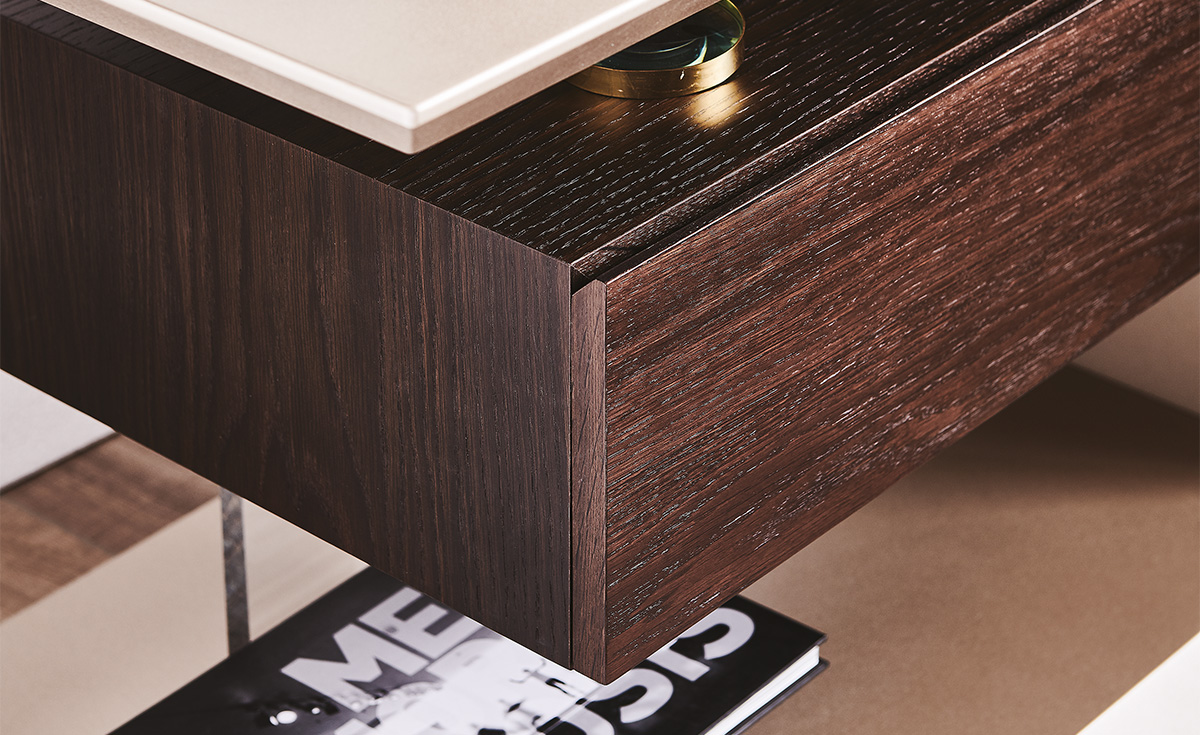 Прикроватная тумба со структурой окрашенной в гофрированный титан (GF11), графит (GF69) или белый (GF71). Ящик в орехе Canaletto (NC) или обоженном дубе (RB).