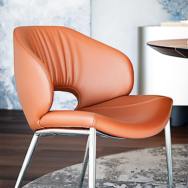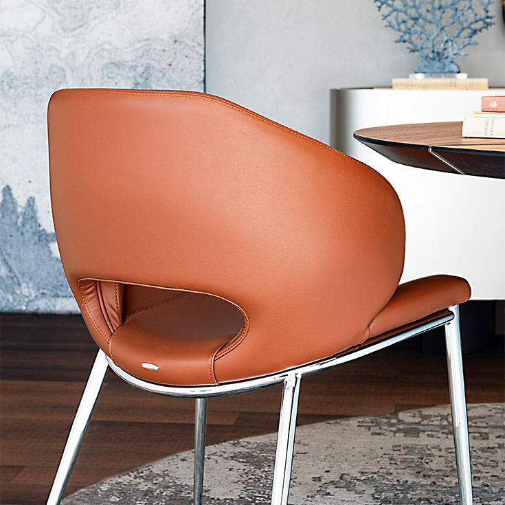 Этот стул с отверстием на спинке украшен мягкими, напоминающими прибрежные волны складками, которые усиливают ощущение комфорта. Часть сиденья отличается ярко выраженным и уютным изгибом, дополнительно подчеркнутым рельефной отстрочкой на коже или ткани. Эта элегантная деталь лишний раз демонстрирует высочайшее качество ручной отделки.