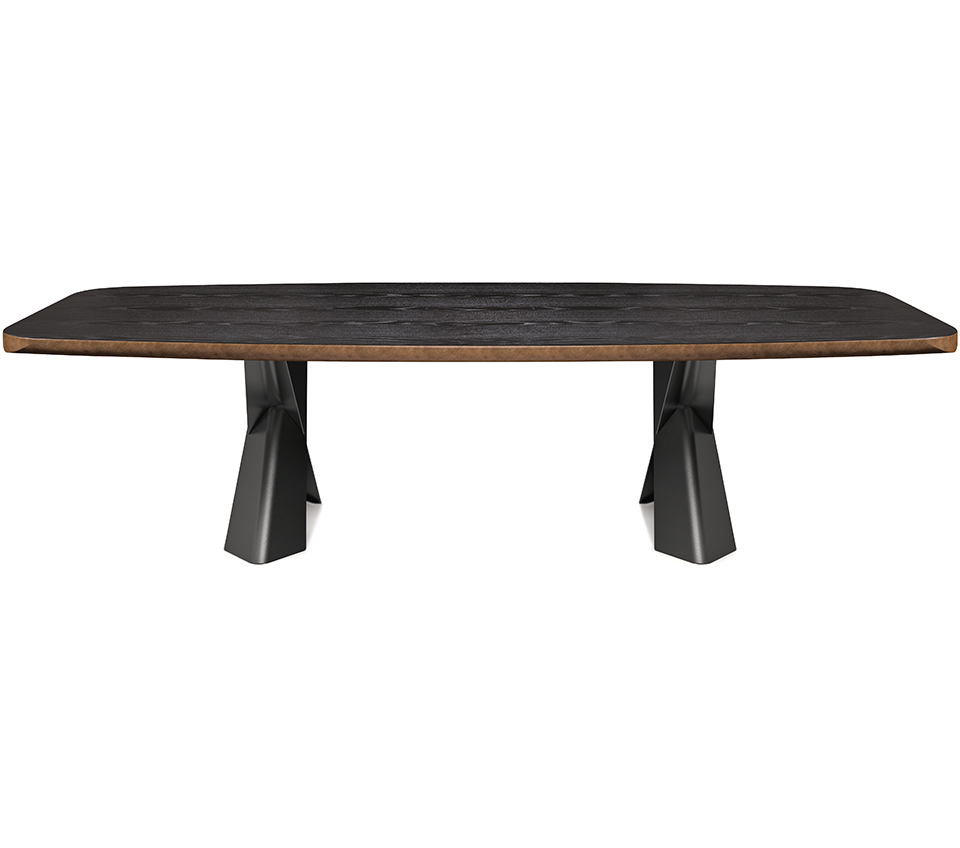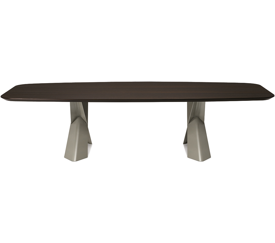 Стол с базой из стали, окрашенной в гофрированный титан (GFM11), бронзу (GFM18), графит (GFM69) или черный (GFM73), Brushed Bronze или Brushed Grey. Версия B: столешница со скошенными краями из ореха Canaletto (NC) или обожженного дуба. Версия S: столешница с неровными краями из массива ореха Canaletto (NC), обожженного дуба (RB) или натурального дуба (RN). Версия "Masterwood": фасонная столешница из ореха Canaletto (NC) или обожженного дуба (RB), выполненная с планками, отличными друг от друга, расположенными по диагонали. Края могут быть косыми или закруглёнными. Цветовые и брашировочные колебания отделки Brushed являются характерными для изготовлений ручным способом и не должны расцениваться как дефекты.