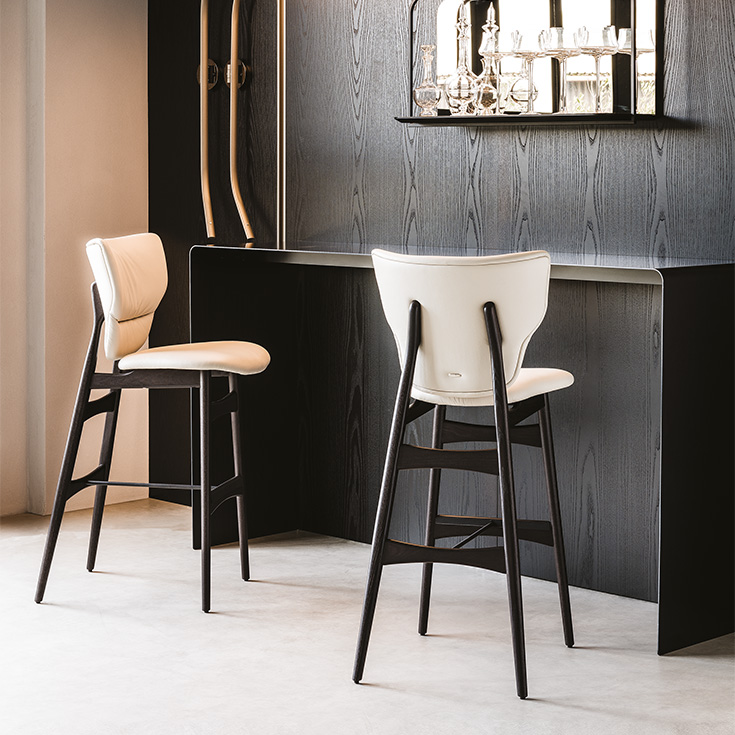 Барный стул с каркасом из ясеня, окрашенного под орех (frNC), под обоженный дуб (frRB) или ясеня с открытими порами, окрашенного в матовый черный (fr73). Сиденье и спинка обиты тканью, мягкой или искуственной кожей цвета согласно образцам.