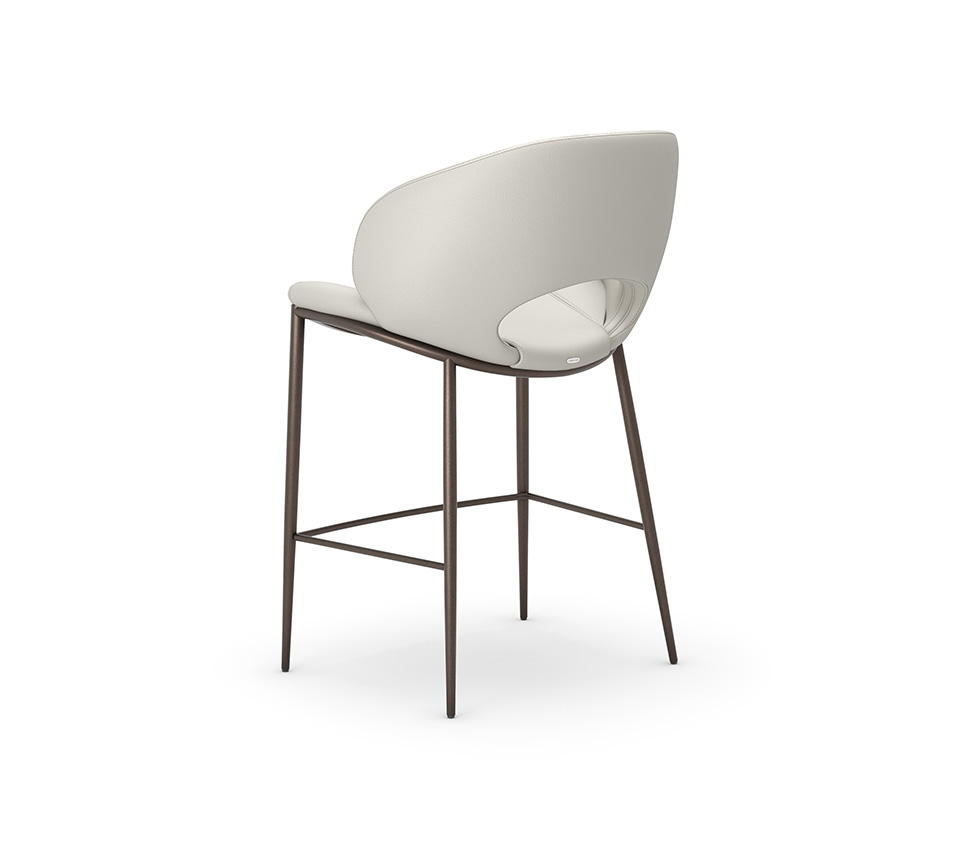 Барный стул с окрашенным тисненным металлическим каркасом в отделке titanio (GFM11), bronzo (GFM18), graphite (GFM69), pearl (GFM70) или nero (GFM73). Сидение может быть выполнено из ткани, микро нубука, экокожи или кожи согласно образцам. Не съемное.