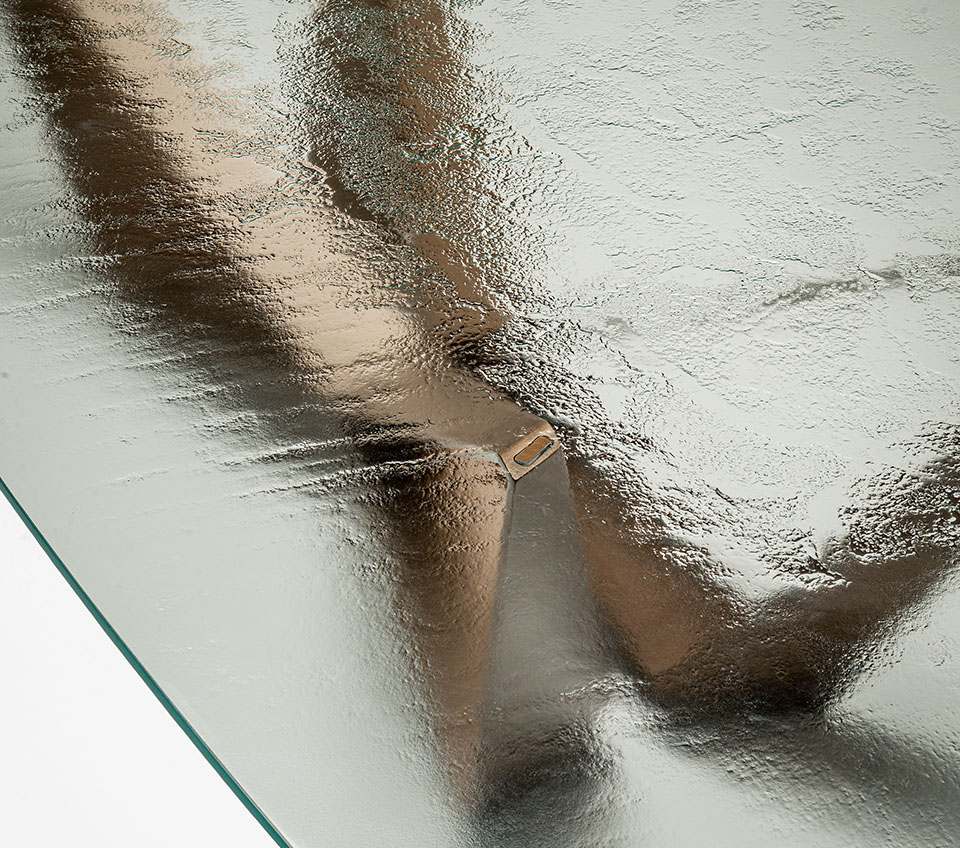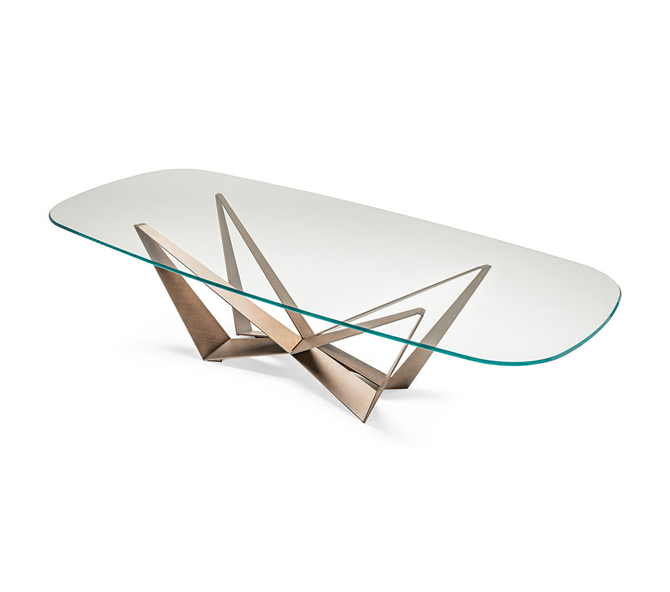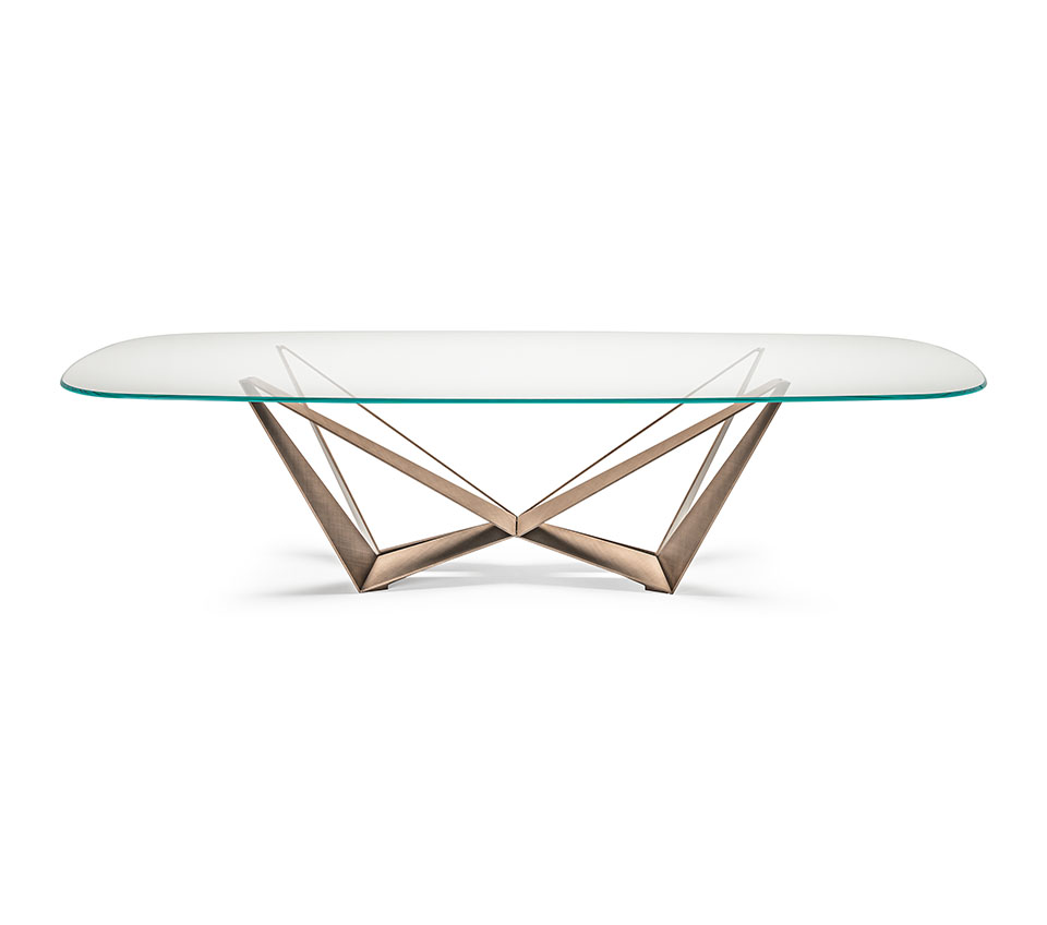 Стол с базой из стали окрашенный в титан (GFM11), бронза (GFM18), графитовый (GFM69), pearl (GFM70), или черный (GFM73), брашированный бронзовый или серый цвет. Топ из 15-миллиметрового прозрачного, сверхпрозрачного, сверхпрозрачного скошенного стекла, стекла с обратными скошенными краями или сверхпрозрачного текстурированного стекла (MIST). Версии размеров 160x90, 182x90 и 200x106 с толщиной столешницы 12мм. Столешница лежит на основании.